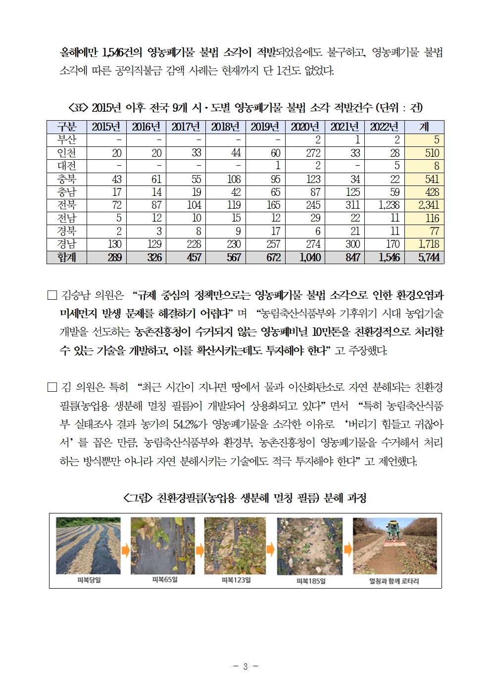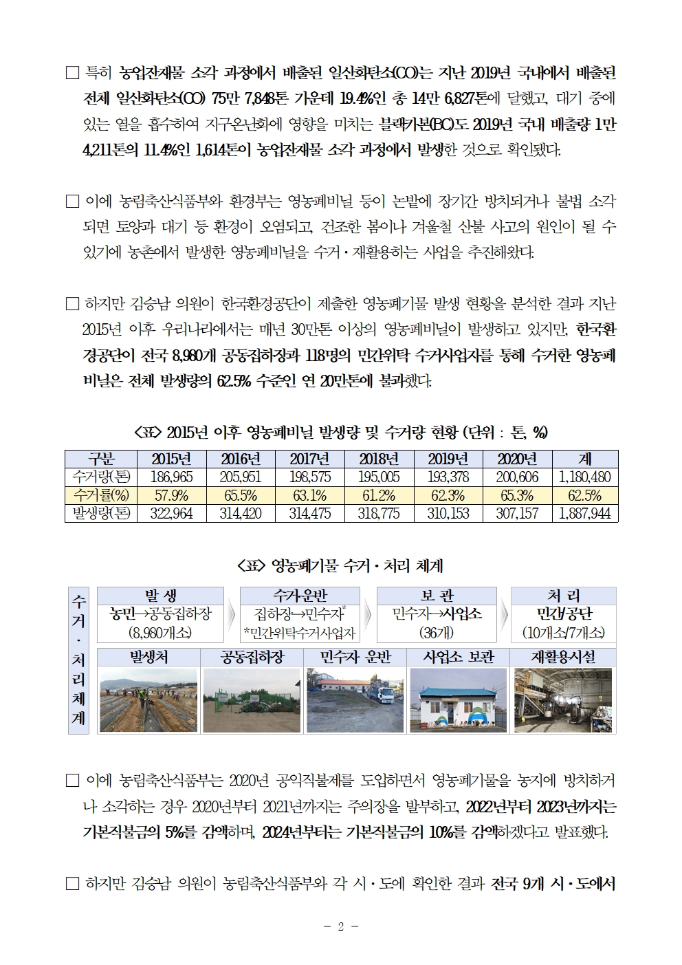 [김승남 보도자료] 매년 논밭에 버려지는 영농폐비닐 10만 톤