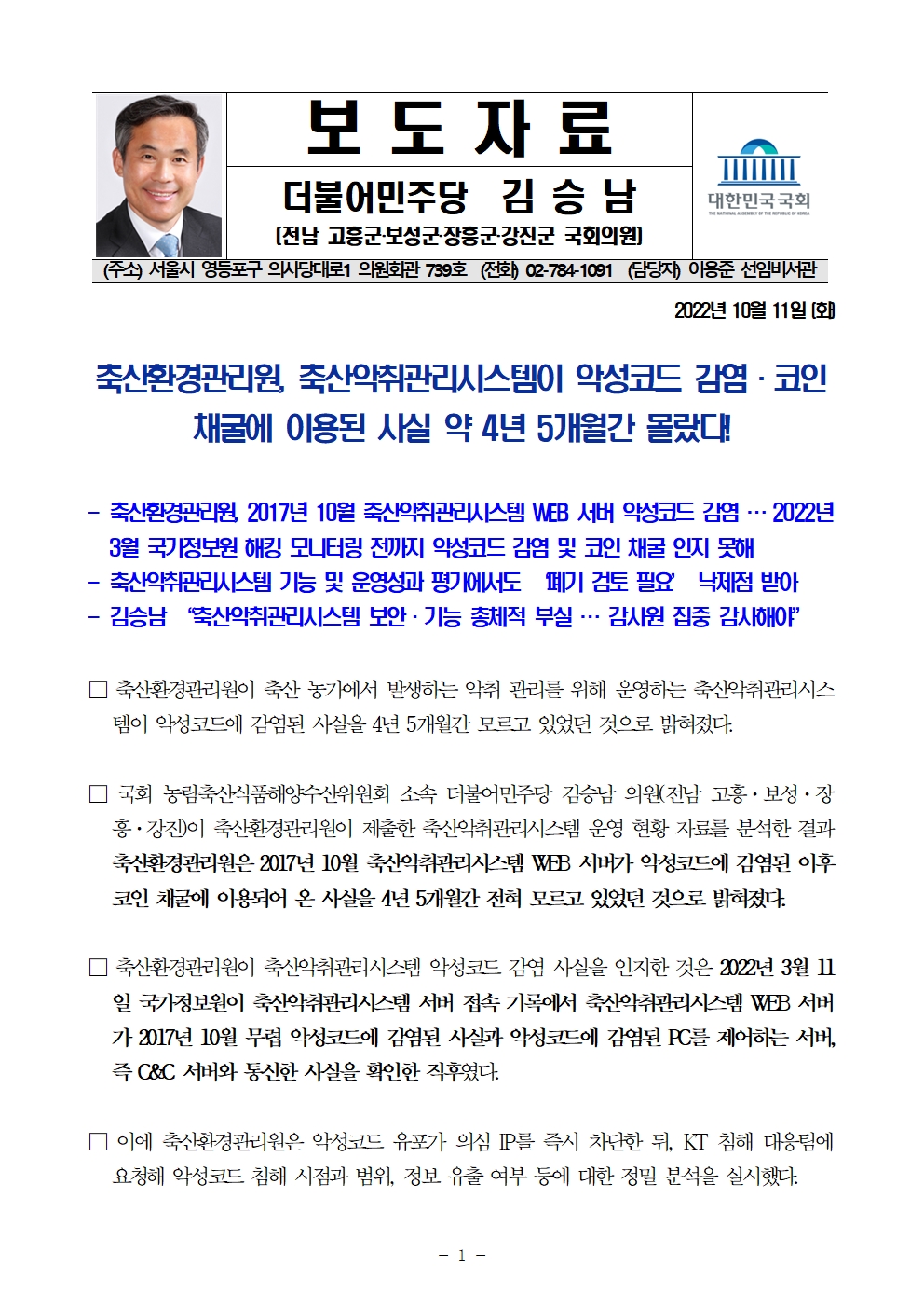 국감_보도자료_20221011_보도자료_김승남_의원_축산악취관리시스템_악성코드_감염,_코인_채굴에_이용.hwp