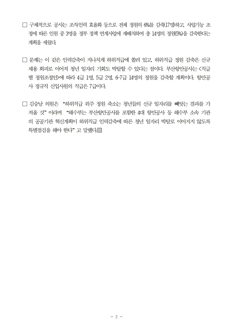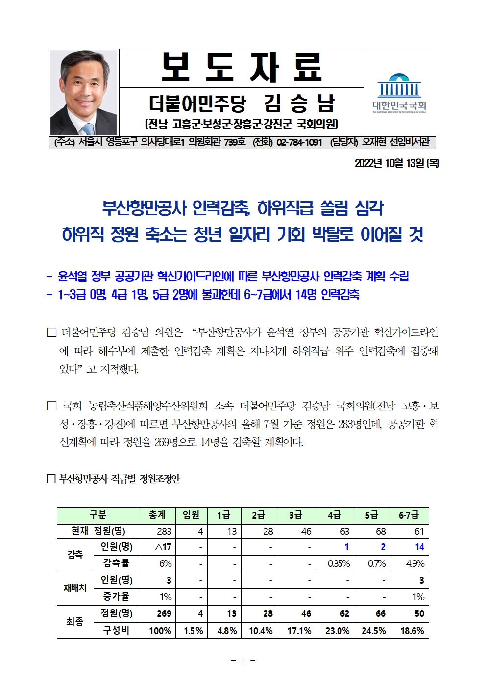 [김승남 보도자료] 부산항만공사 인력감축, 하위직급 쏠림 심각
