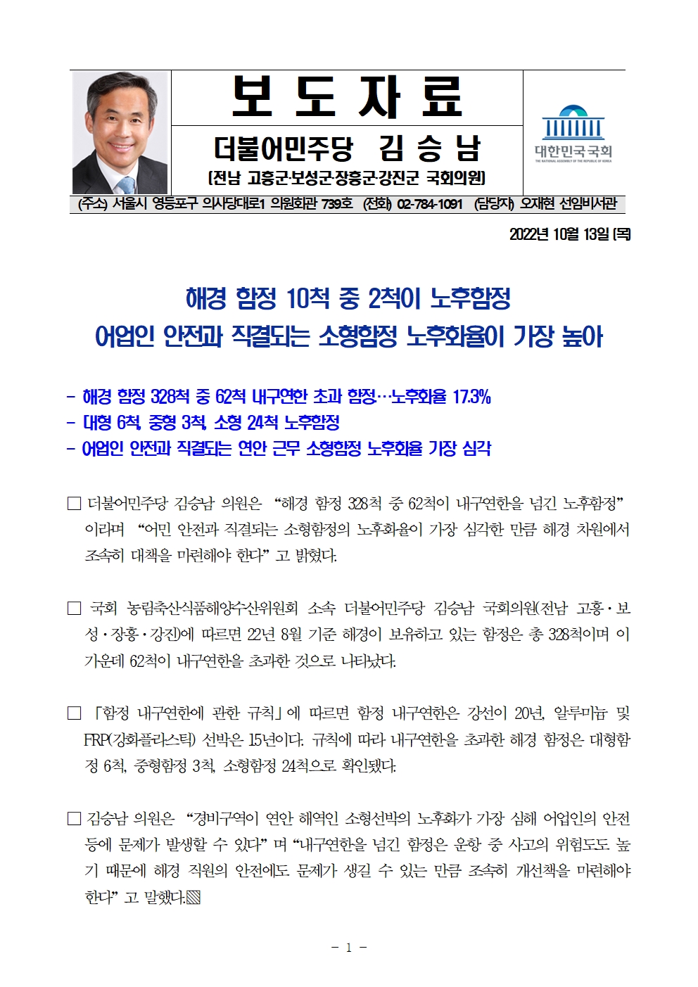 [김승남 보도자료] 해경 함정 10척 중 2척이 노후함정 어업인 안전과 직결되는 소형함정 노후화율이 가장 높아