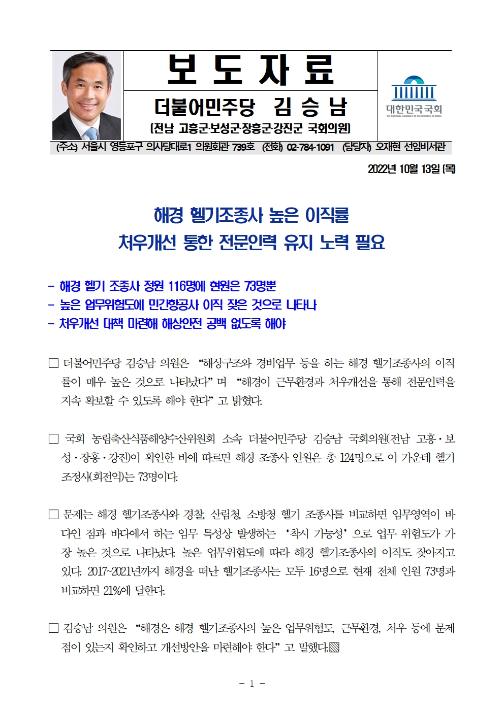 [김승남 보도자료] 해경 헬기조종사 높은 이직률 처우개선 통한 전문인력 유지 노력 필요