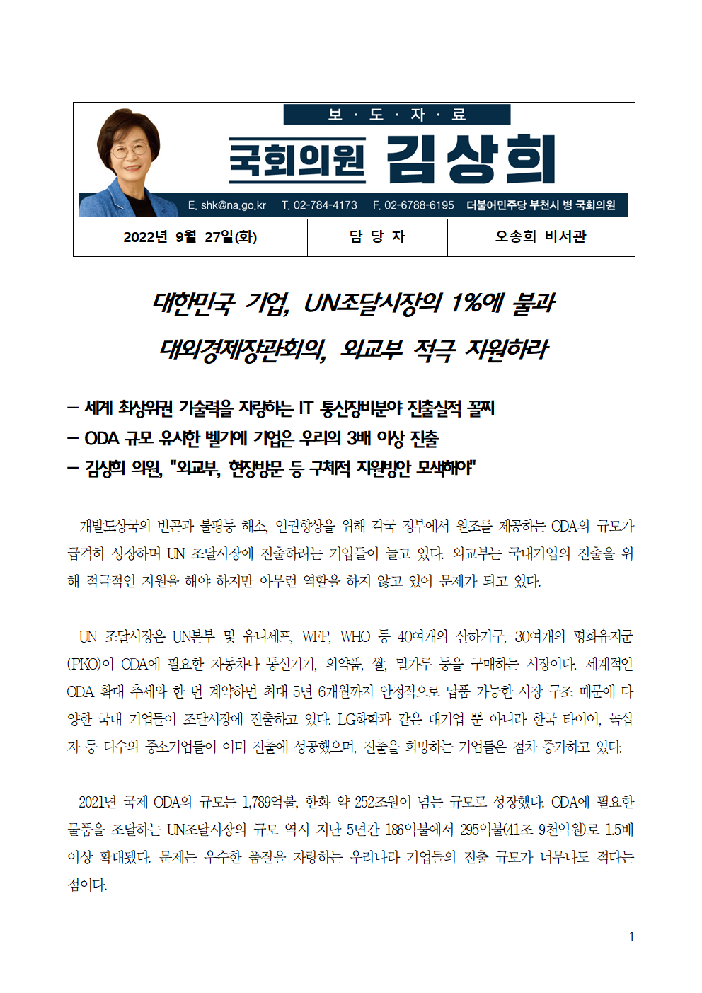20220927_국회의원_김상희_보도자료_대한민국_기업_UN_조달시장의_1퍼센트에_불과,_외교부_적극_지원_필요.hwp
