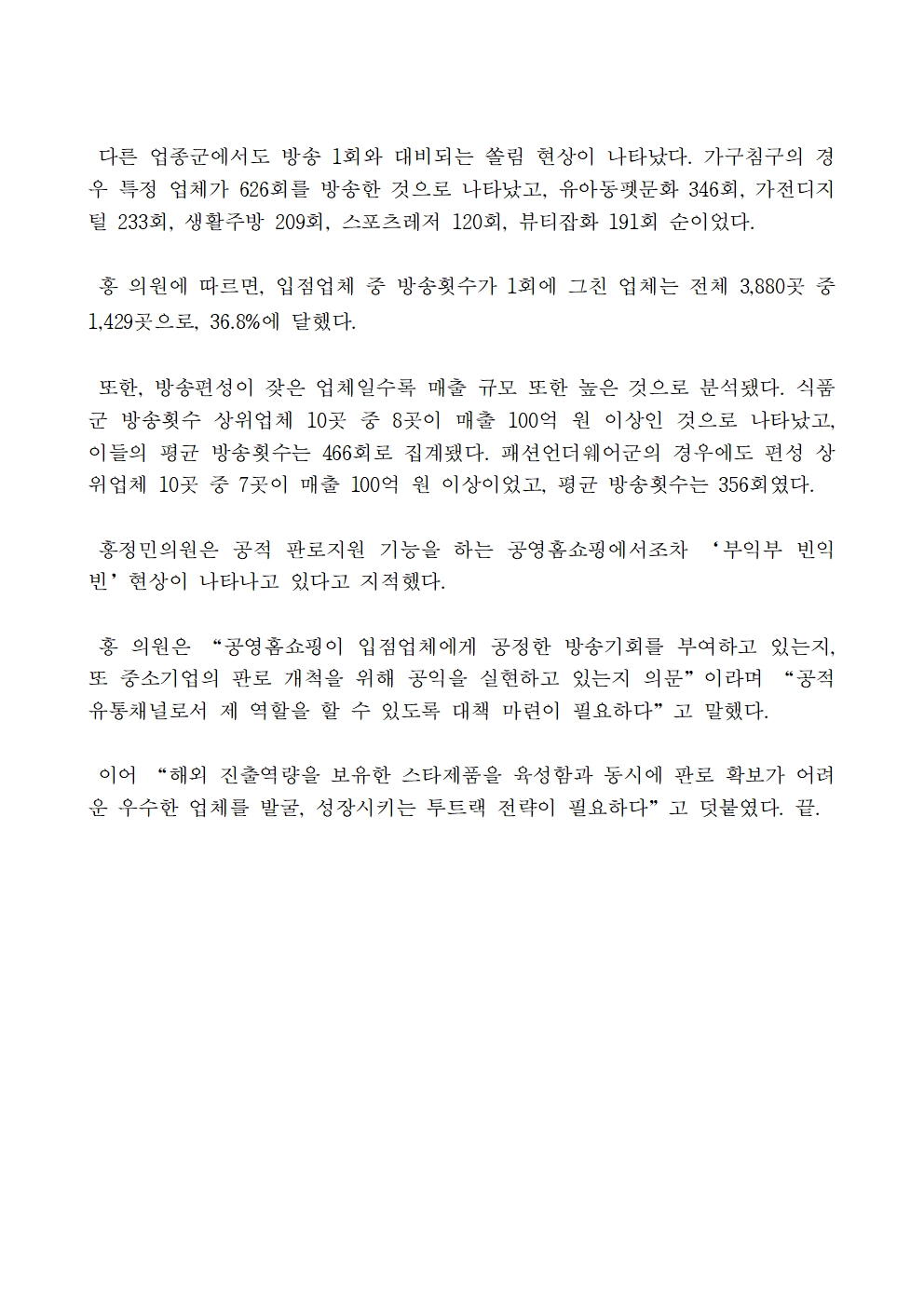 [국회의원 홍정민] 공영홈쇼핑 방송편성 일부 업체에‘몰아주기’… 입점업체간 최대 1,203회 차이