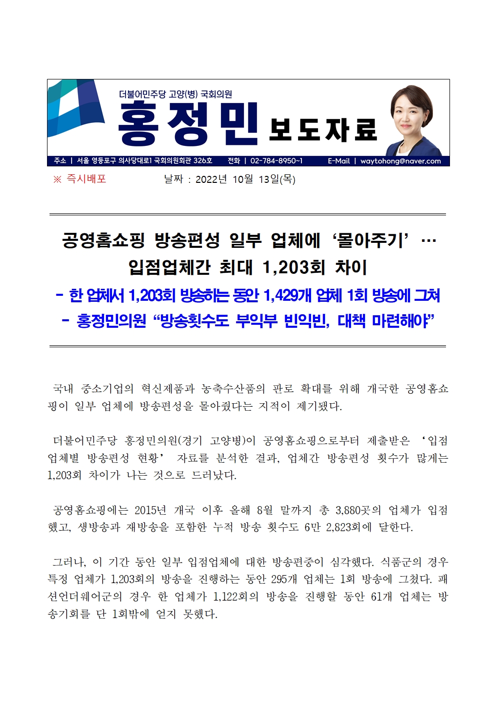 보도자료_공영홈쇼핑_방송편성_일부_업체에_`몰아주기`,_최대_1,203회_차이_221013.hwp