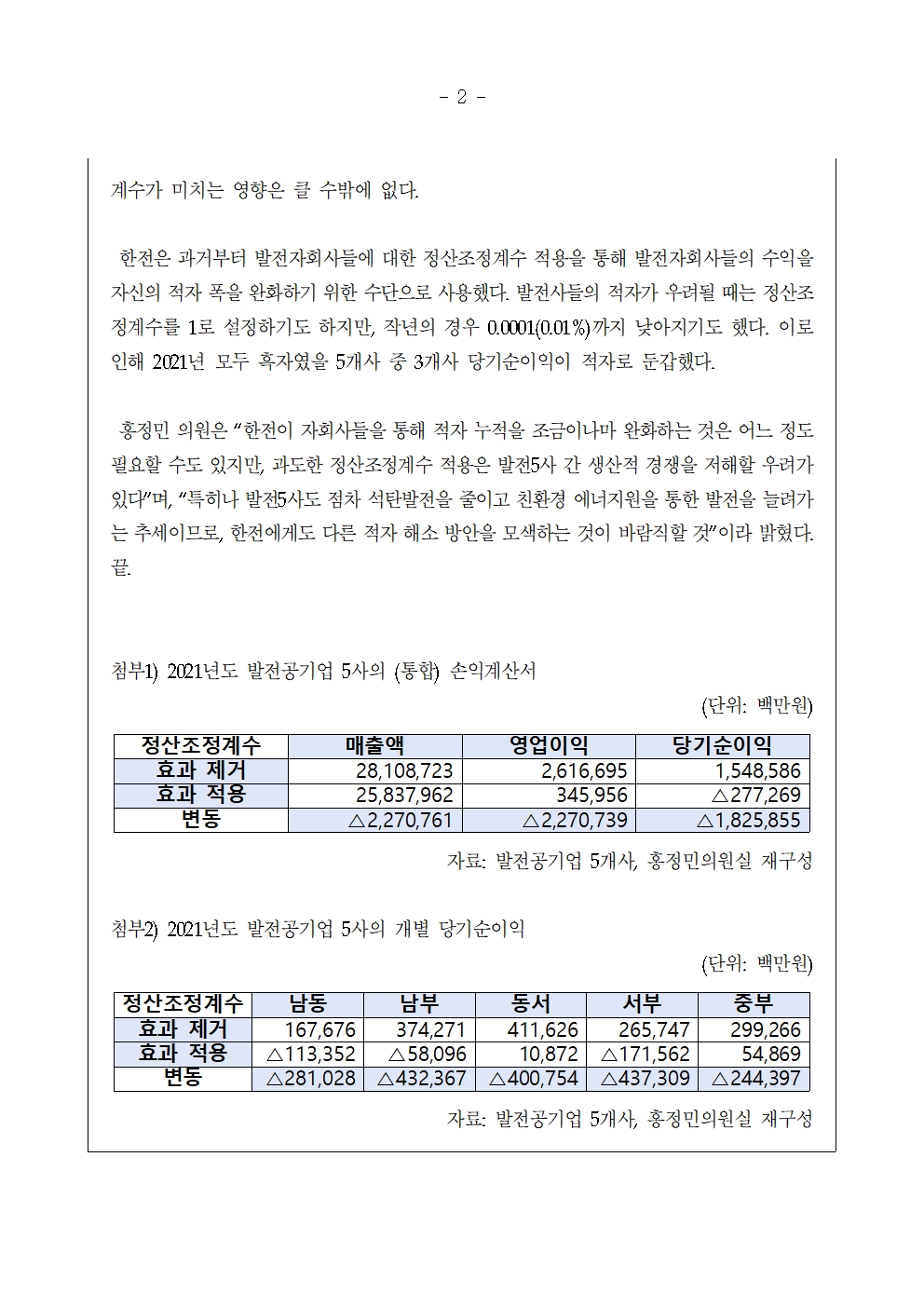 [국회의원 홍정민] 발전5사, 정산조정계수 아니었으면 1.8조원 더 벌었다