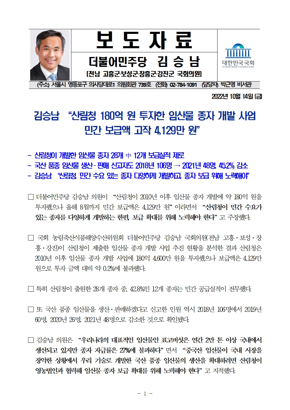 국감_보도자료_20221014__김승남_의원_“산림청_180억_원_투자한_임산물_종자_개발_사업_민간_보급액_고작_4,129만_원”.hwp
