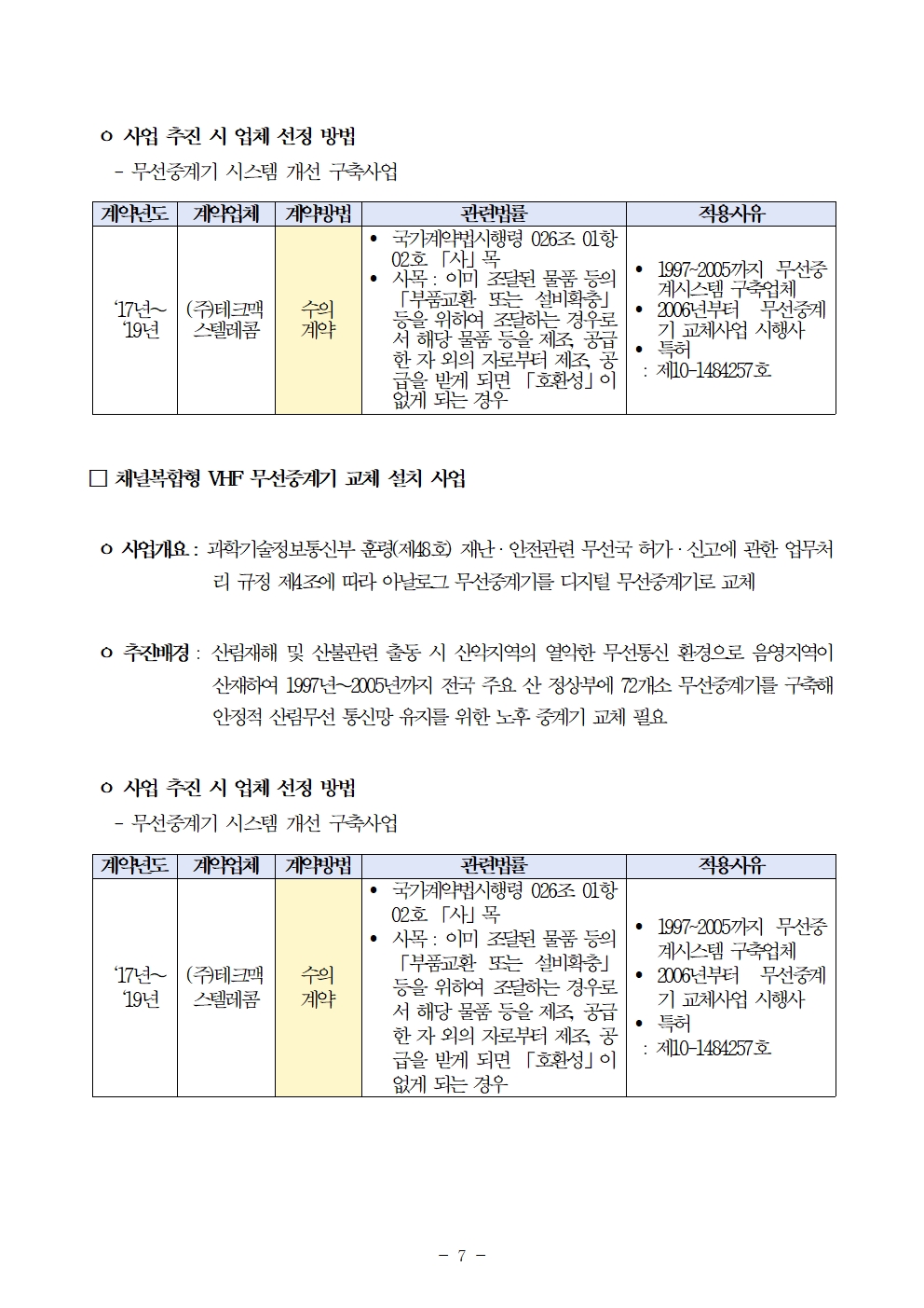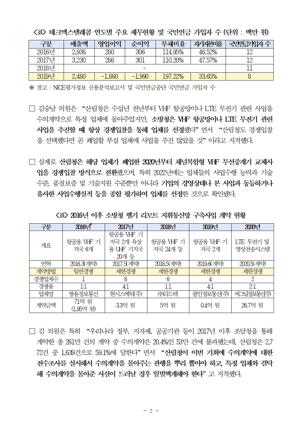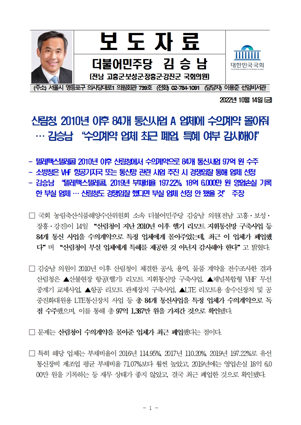 [김승남 보도자료] 산림청, 2010년 이후 84개 통신사업 A 업체에 수의계약 몰아줘