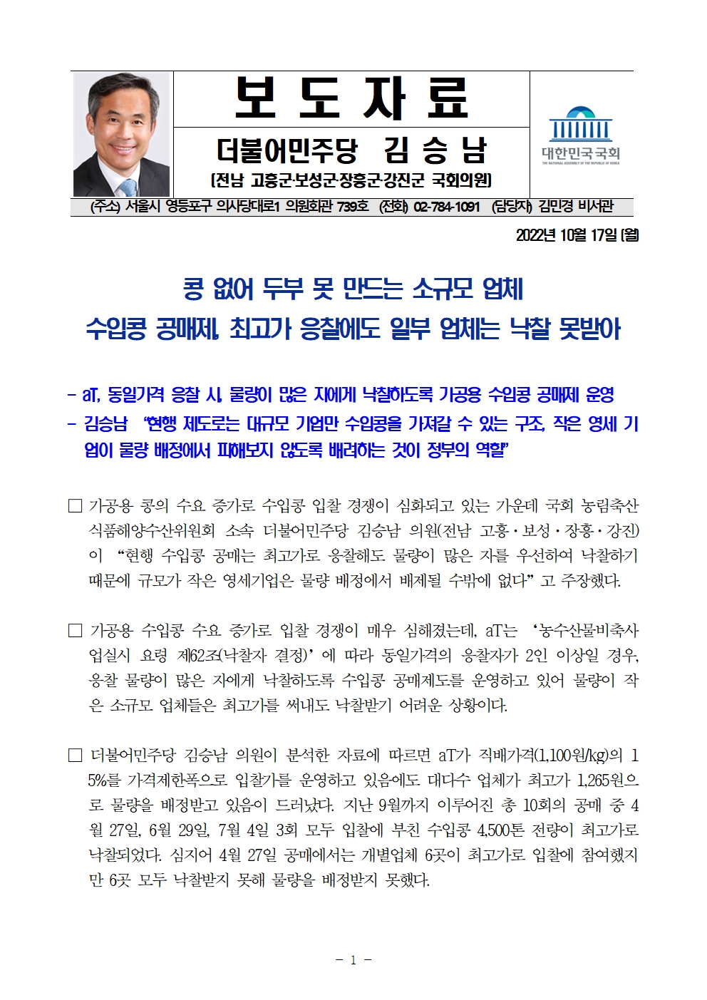 국감_보도자료_20221017_김승남,_콩_없어_두부_못만드는_소규모_업체_보호해야.hwp