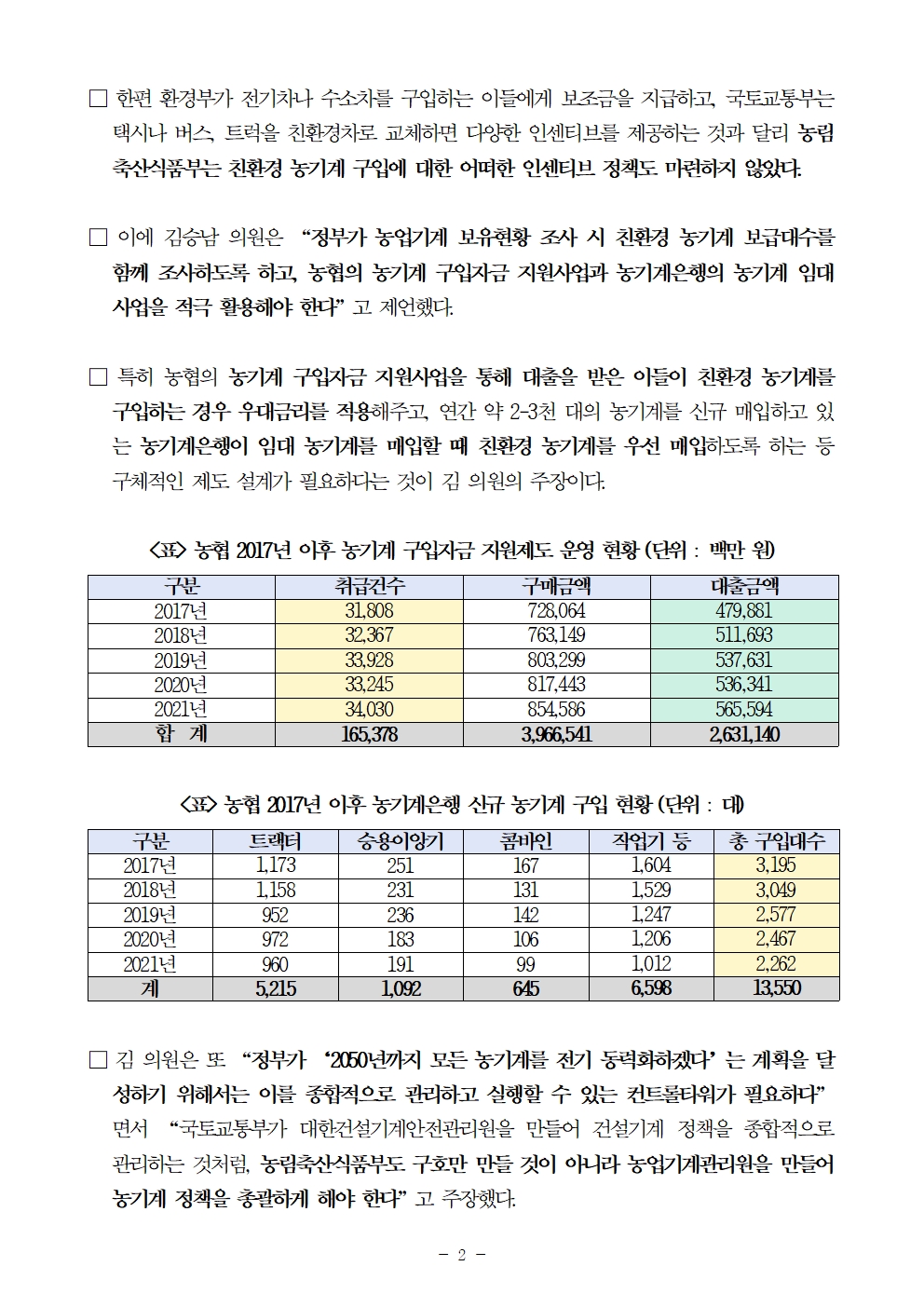 [김승남 보도자료] 농식품부 2050년 모든 농기계 전기 동력화 계획 발표했지만, 김승남 “친환경 농기계 보급 통계, 인센티브 정책 전무”