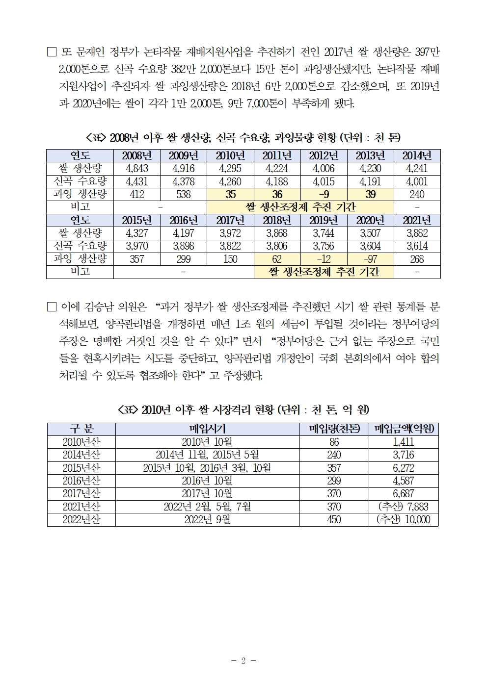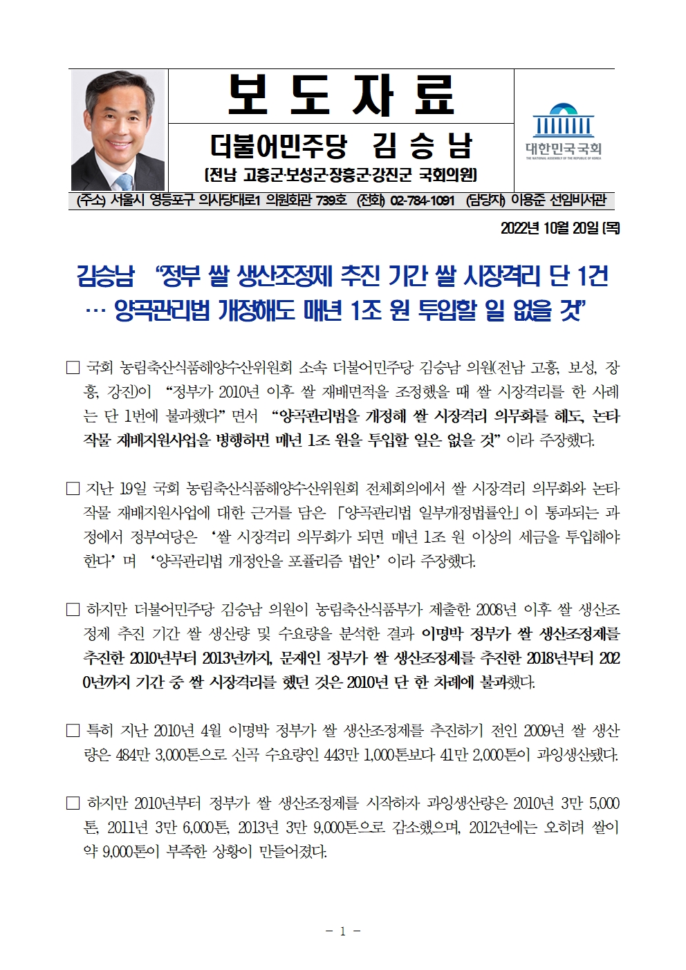 국감_보도자료_20221020_보도자료_김승남_의원_정부_쌀_생산조정제_추진_기간_쌀_시장격리_단_1건.hwp