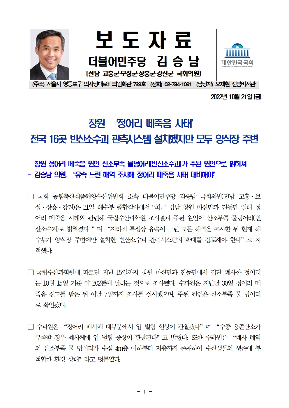 국감_보도자료_20221021_김승남_창원_‘정어리_떼죽음_사태_전국_16곳_빈산소수괴_관측시스템_설치했지만_모두_양식장_주변.hwp