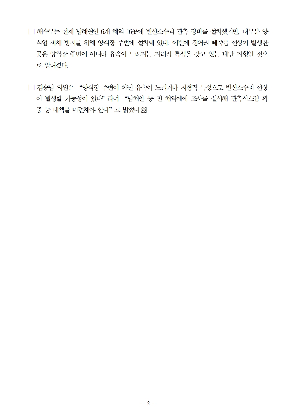 [김승남 보도자료] 창원 ‘정어리 떼죽음 사태’ 전국 16곳 빈산소수괴 관측시스템 설치했지만 모두 양식장 주변