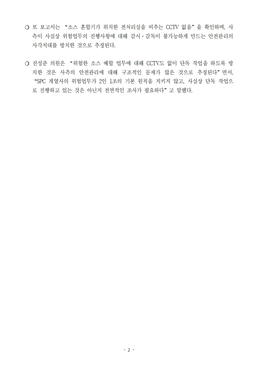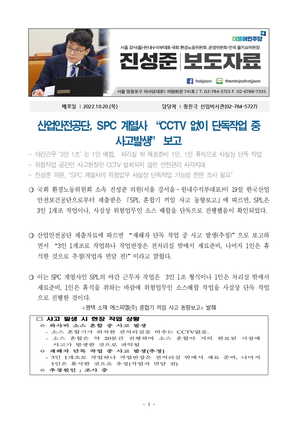 [진성준의원 보도자료] 산업안전공단, SPC 계열사 “CCTV 없이 단독작업 중 사고발생” 보고
