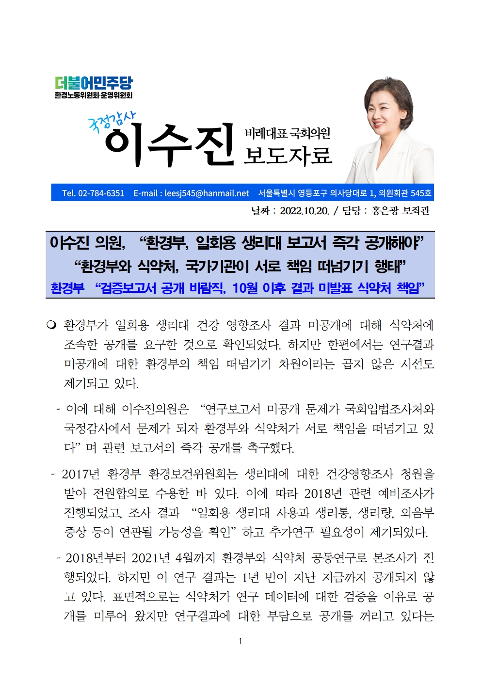 [이수진 의원(비) 보도자료] 환경부, 일회용 생리대 보고서 즉각 공개해야