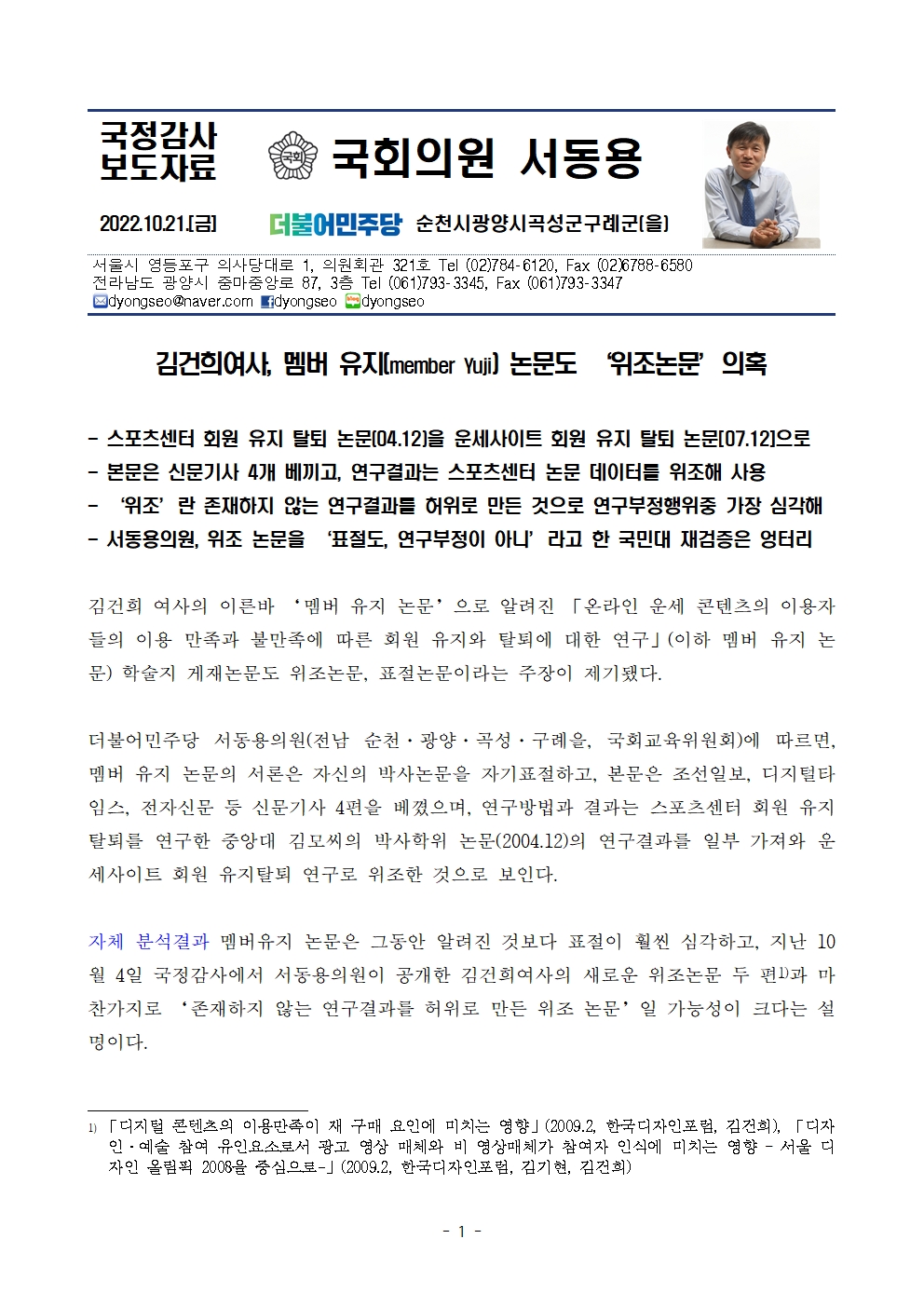 [서동용의원 보도자료] 김건희여사, 멤버 유지(member Yuji) 논문도 '위조논문' 의혹