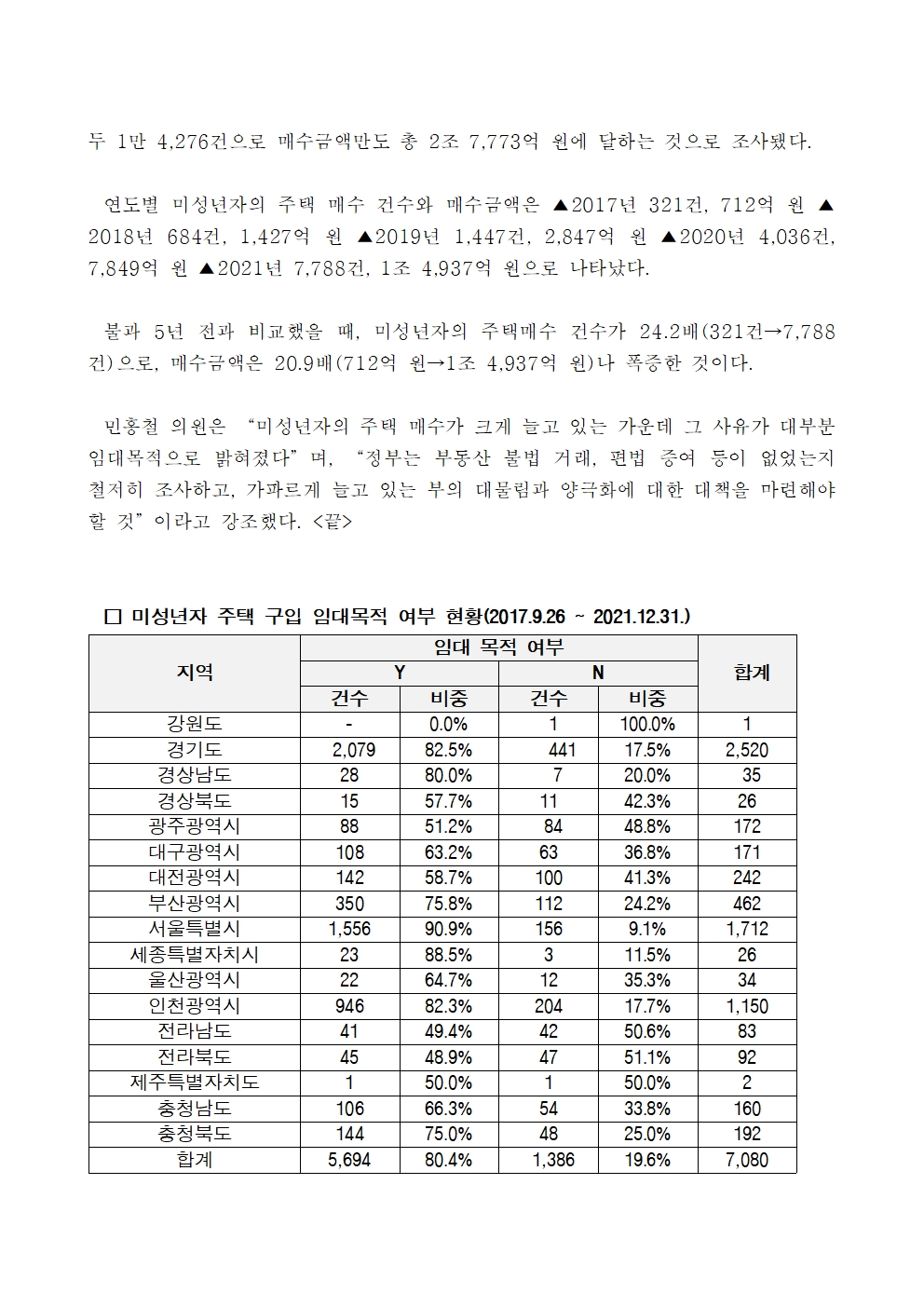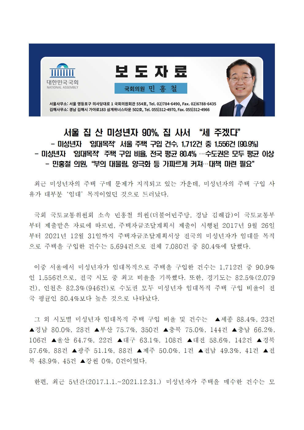 [민홍철의원실 보도자료]서울 집 산 미성년자 90%, 집 사서 “세 주겠다”