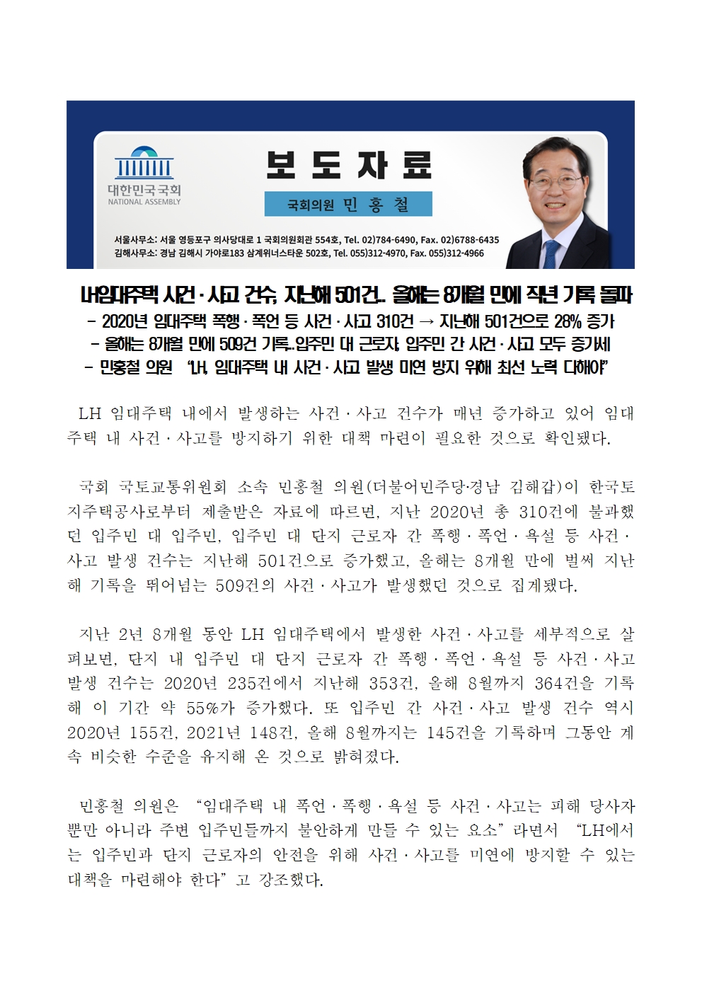 [민홍철의원실 보도자료]LH임대주택 사건·사고 건수, 지난해 501건... 올해는 8개월 만에 작년 기록 돌파