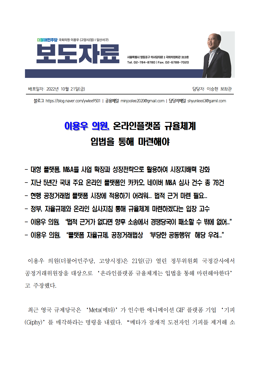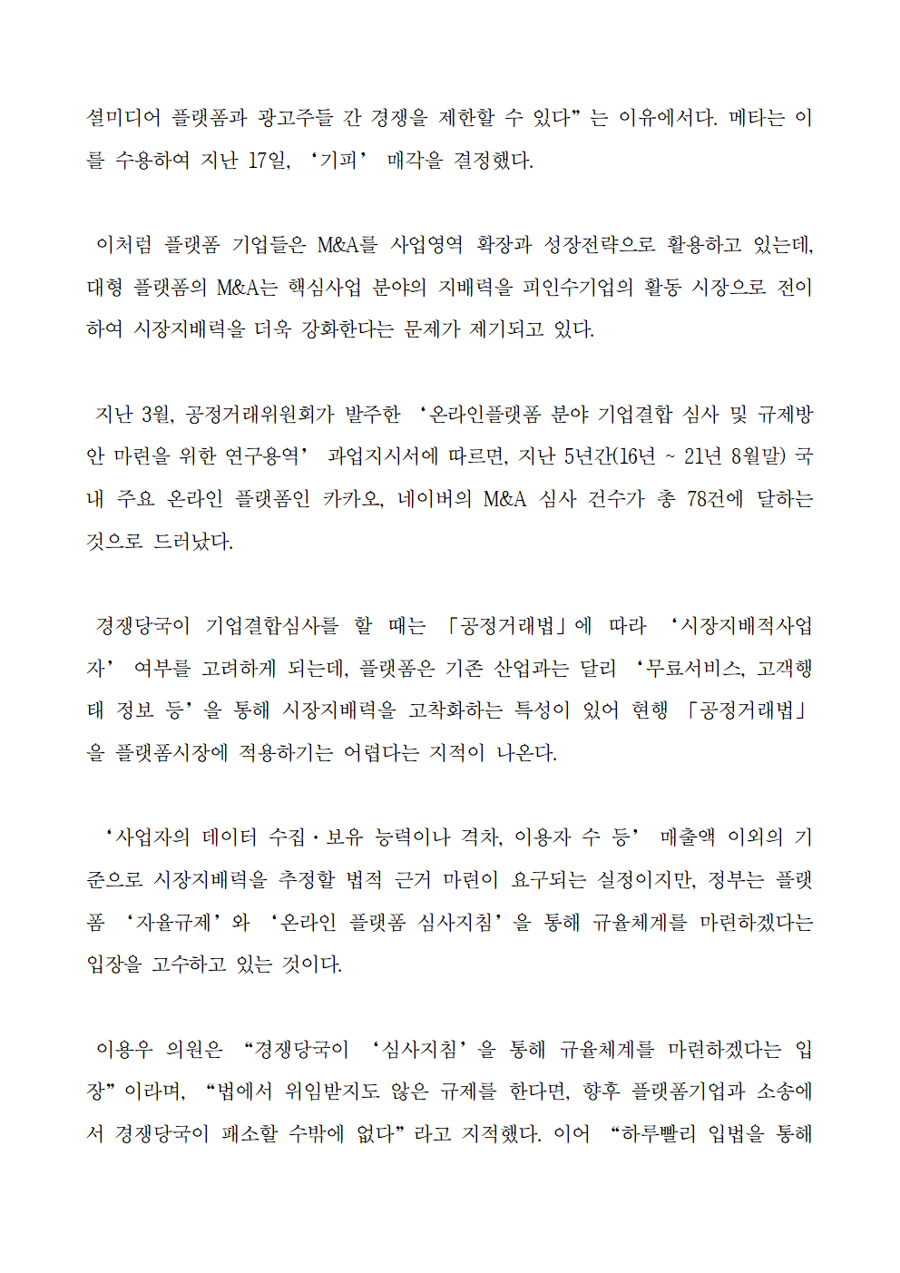[이용우 의원 보도자료] 이용우 의원, 온라인플랫폼 규율체계 입법을 통해 마련해야