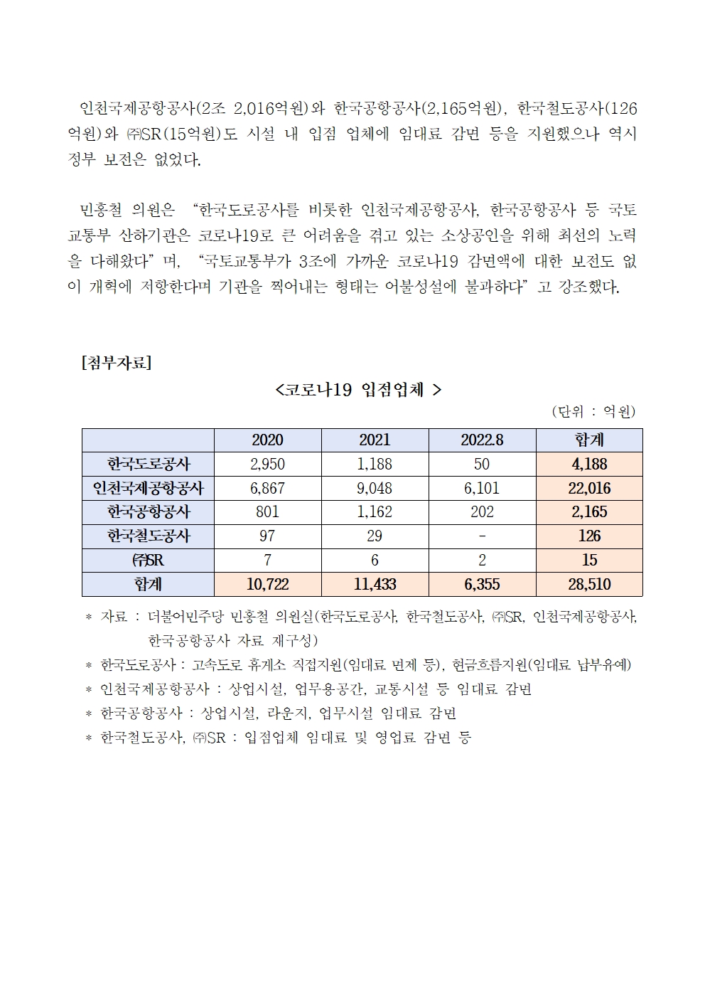 2022-10-04_보도자료_코로나19_철도_등_소상공인_3조원_지원했는데_정부_보전_0원(민홍철의원실).hwp