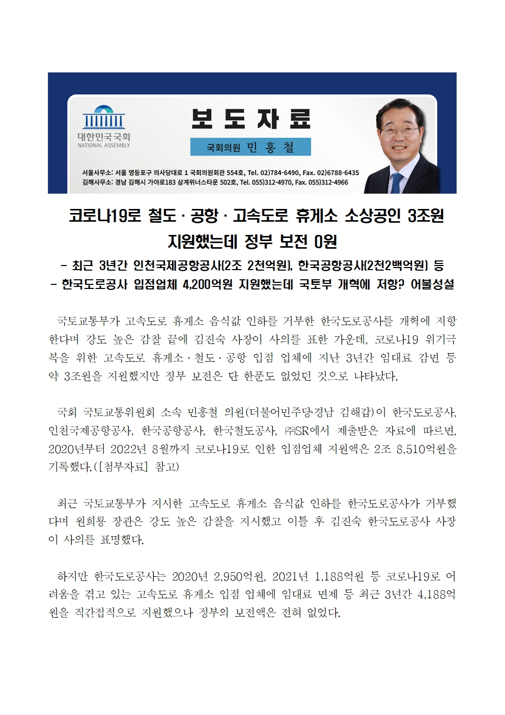 [민홍철의원실 보도자료]코로나19로 철도·공항·고속도로 휴게소 소상공인 3조원 지원했는데 정부 보전 0원