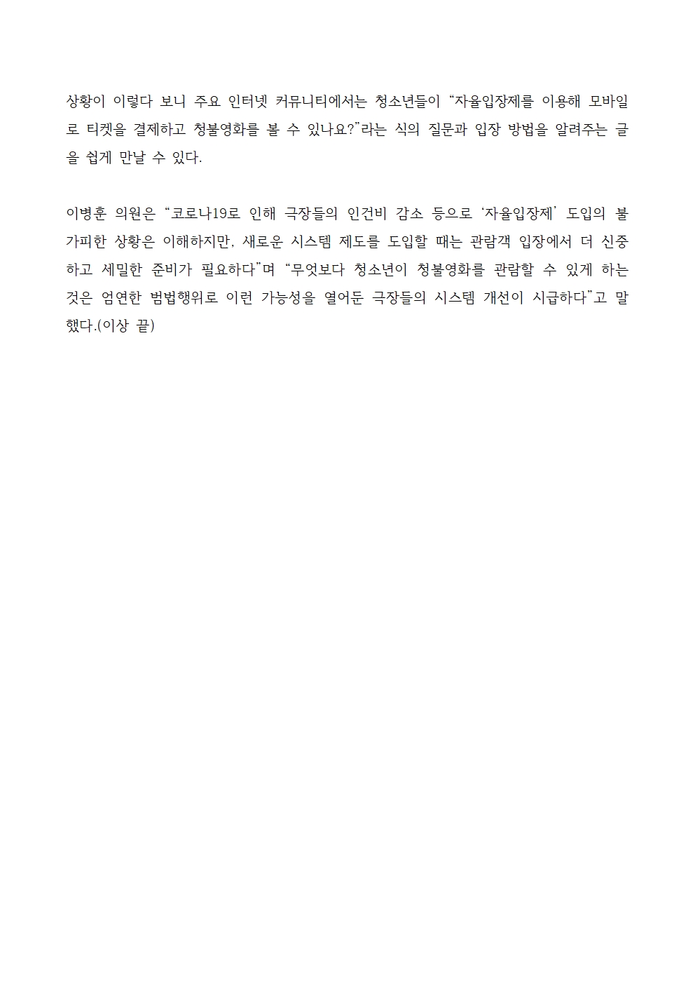 [이병훈 의원 보도자료] 영화관 자율입장제는 청소년 관람불가 영화 자율입장제?