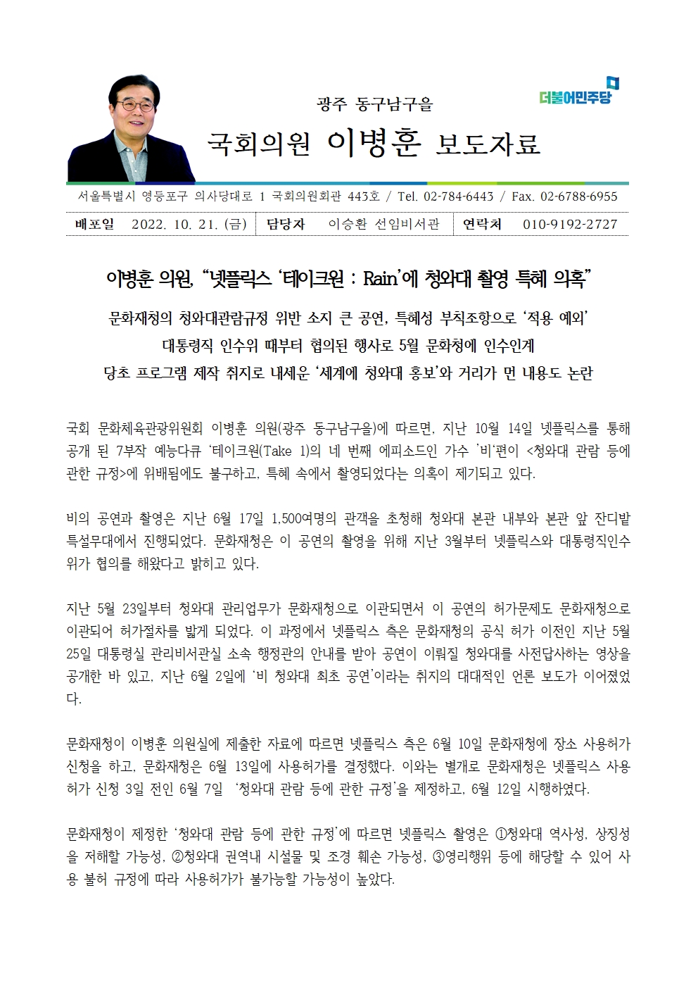 [이병훈 의원 보도자료] 이병훈 의원, “넷플릭스 ‘테이크원 : Rain’에 청와대 촬영 특혜 의혹”