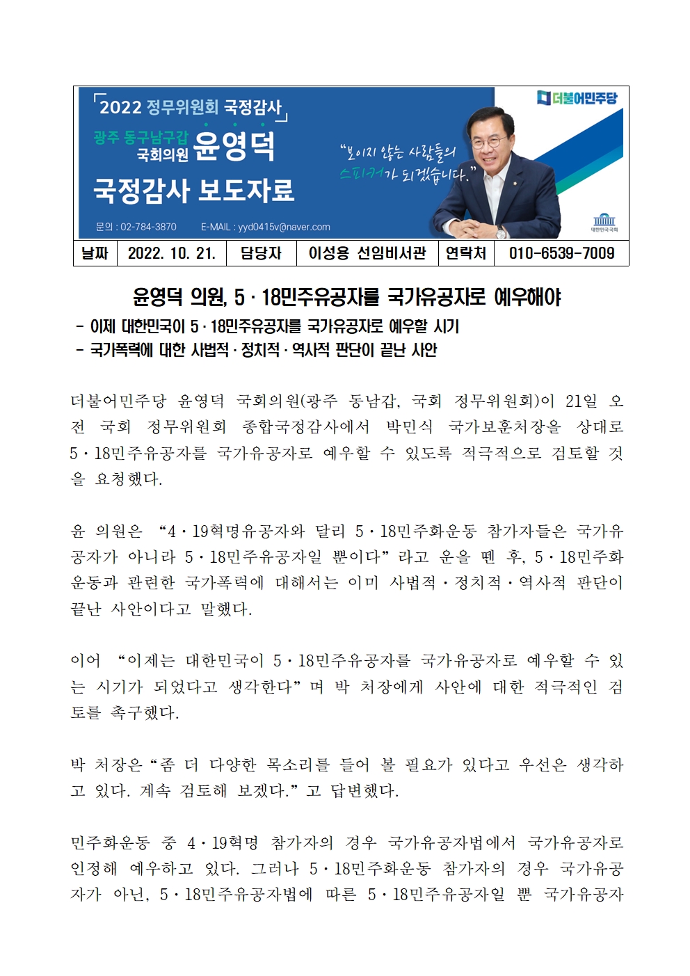 221021_윤영덕국회의원_보도자료__윤영덕_의원,_5·18민주유공자를_국가유공자로_예우해야_.hwp
