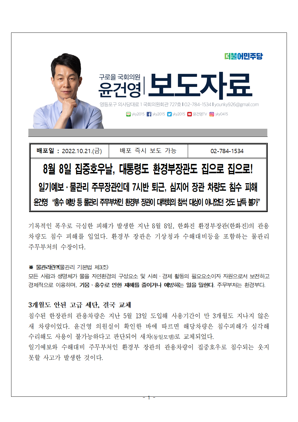 [국회의원 윤건영 보도자료] 8월 8일 집중호우날, 대통령도 환경부장관도 집으로 집으로!