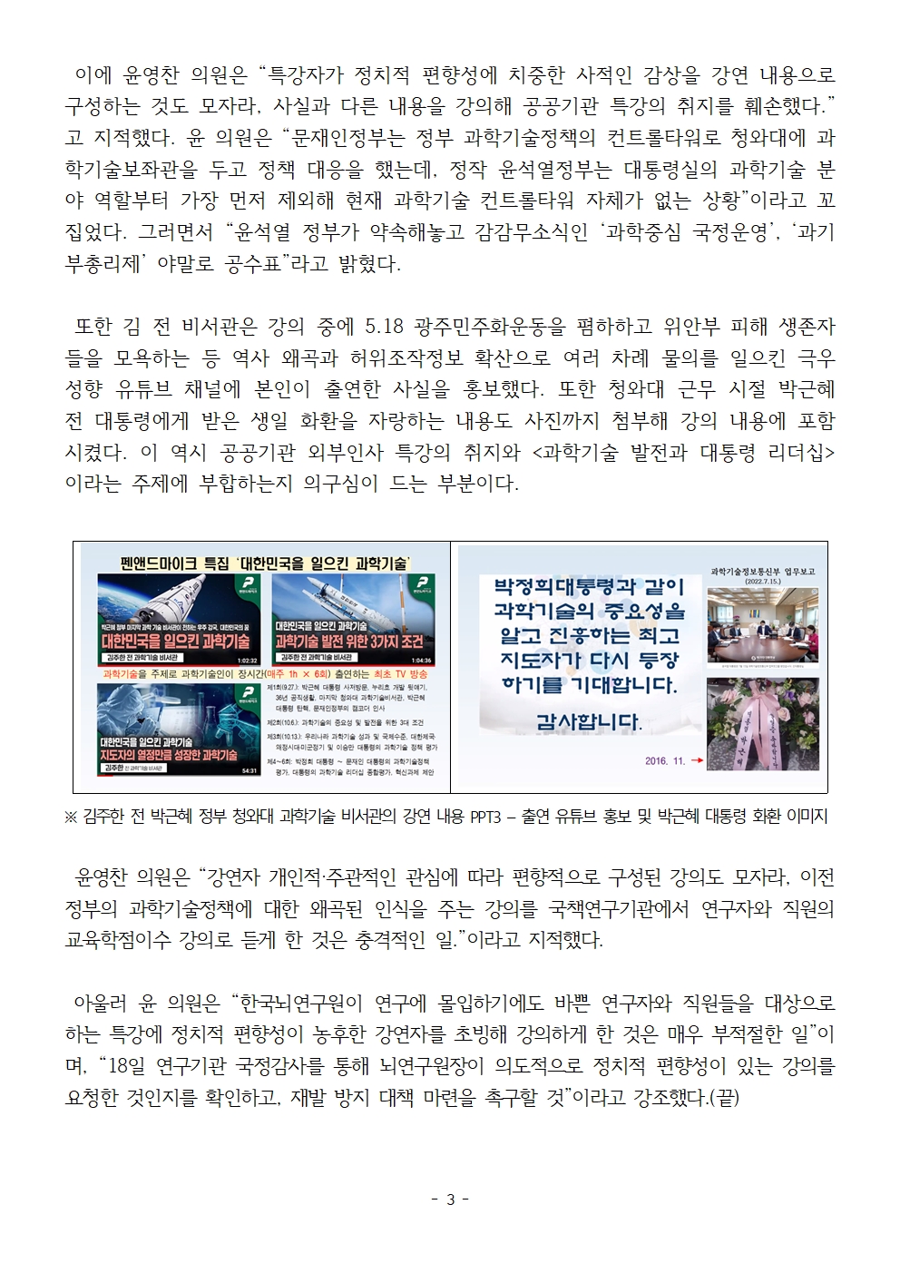 [윤영찬 의원실 보도자료] 한국뇌연구원_정치편향적_특강_개선필요