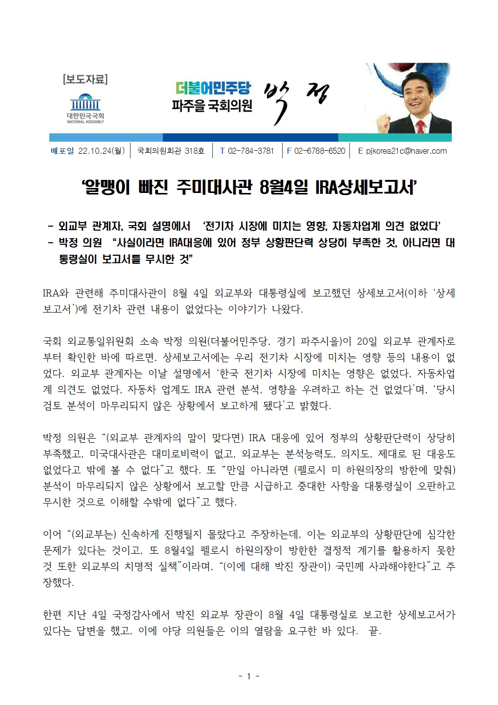 [박정 의원 보도자료] ‘알맹이 빠진 주미대사관 8월4일 IRA상세보고서’