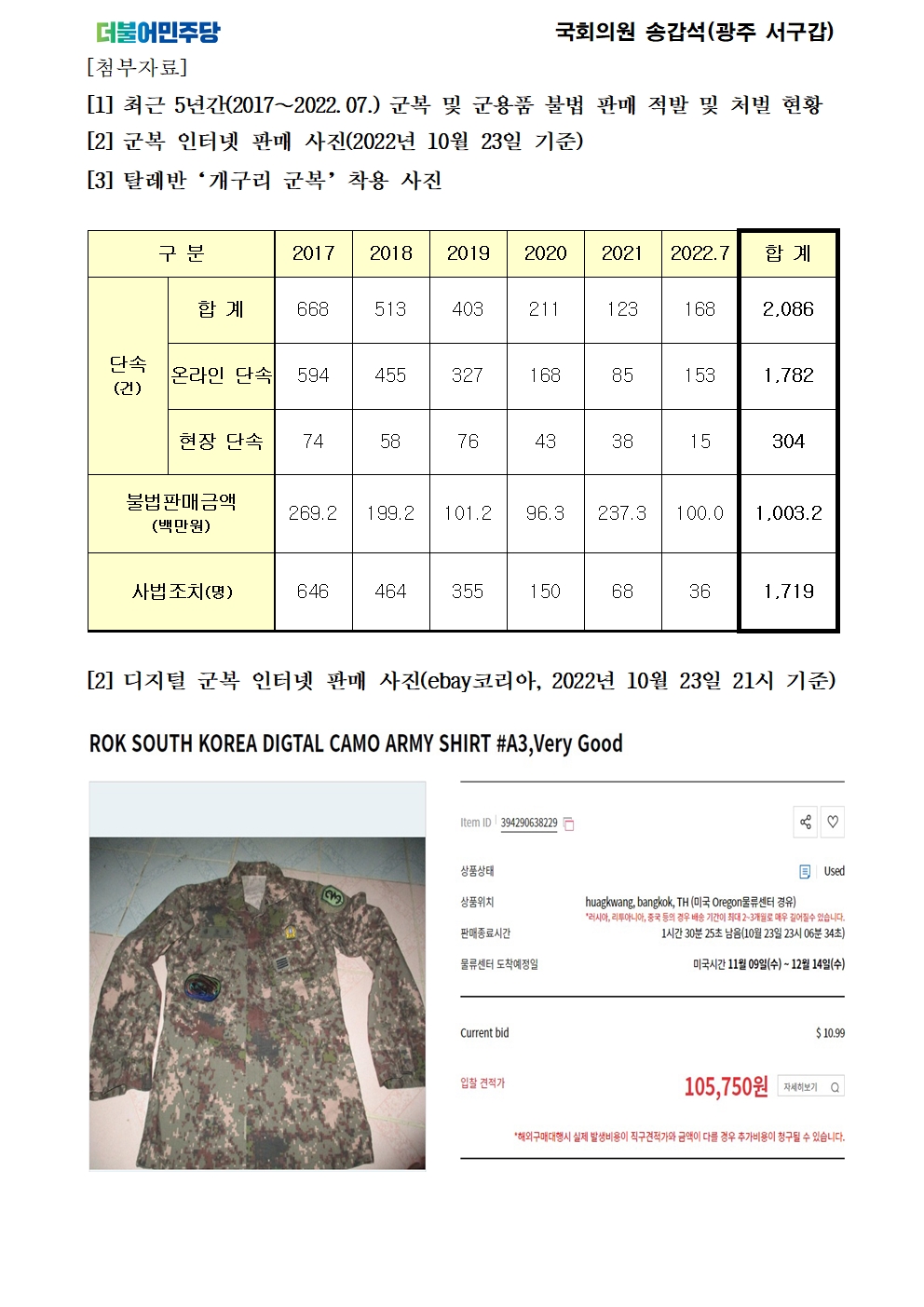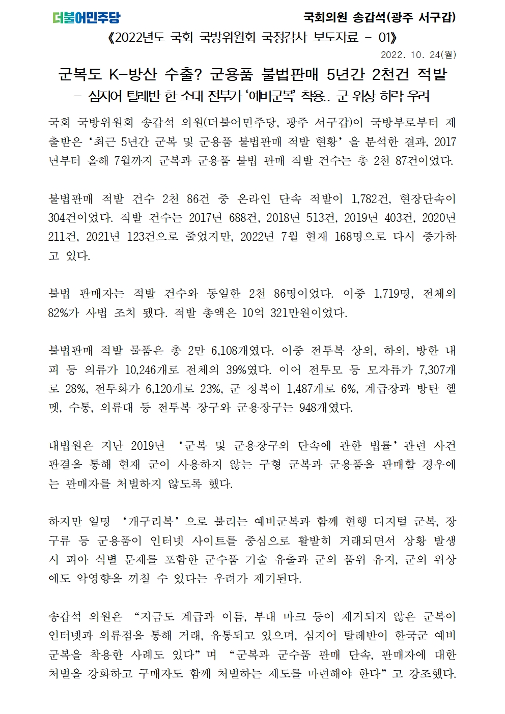 [국회의원 송갑석 보도자료] 군복도 K-방산 수출? 군용품 불법판매 5년간 2천건 적발