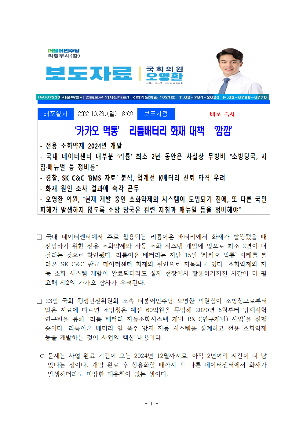 [국회의원 오영환] ‘카카오 먹통’ 리튬배터리 화재 대책 ‘깜깜’