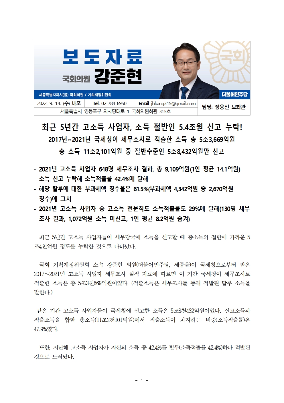 220914_강준현의원_보도자료_최근_5년간_고소득_사업자,_소득_절반_신고_누락,_총_5_4조원에_달해.hwp