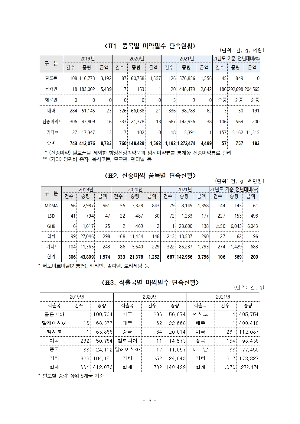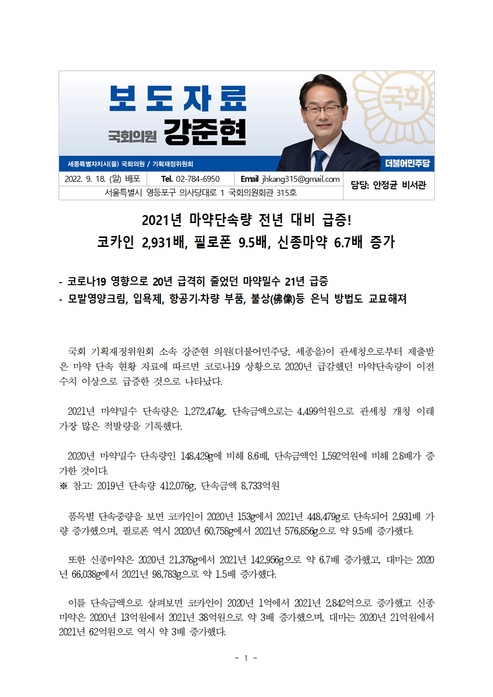 [국회의원 강준현][보도자료]2021년 마약단속량 전년 대비 급증! 코카인 2,931배, 필로폰 9.5배, 신종마약 6.7배 증가