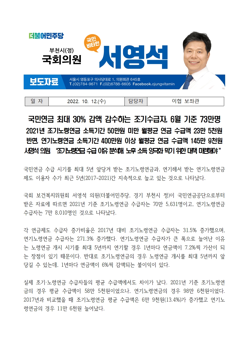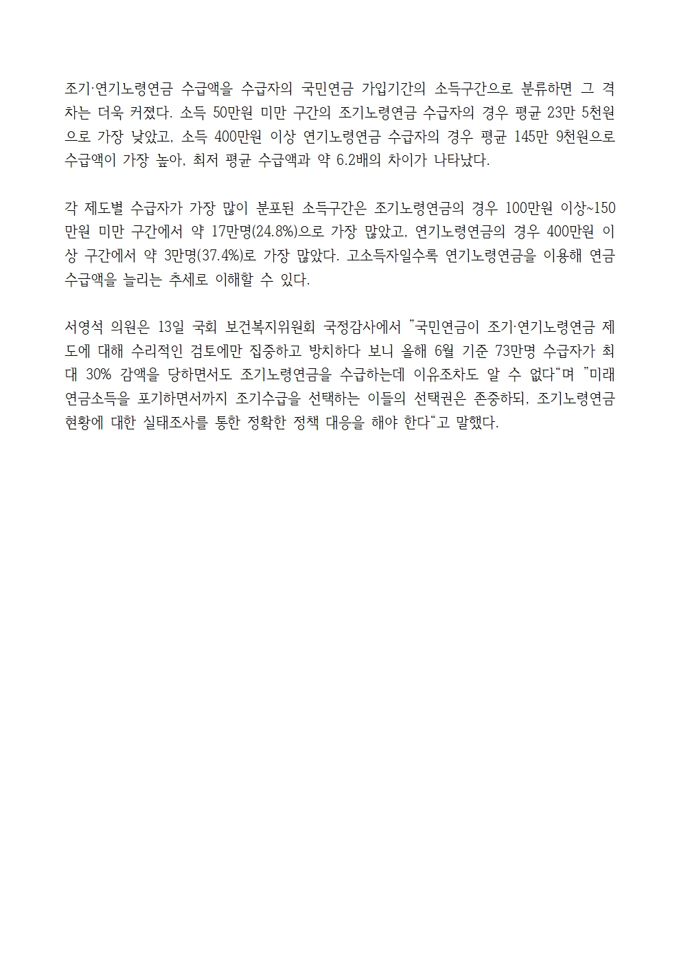 [국회의원 서영석] 국민연금 최대 30% 감액 감수하는 조기수급자, 6월 기준 73만명