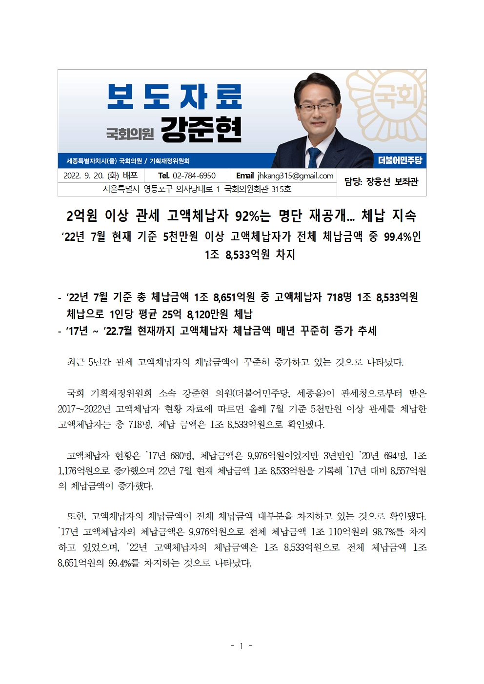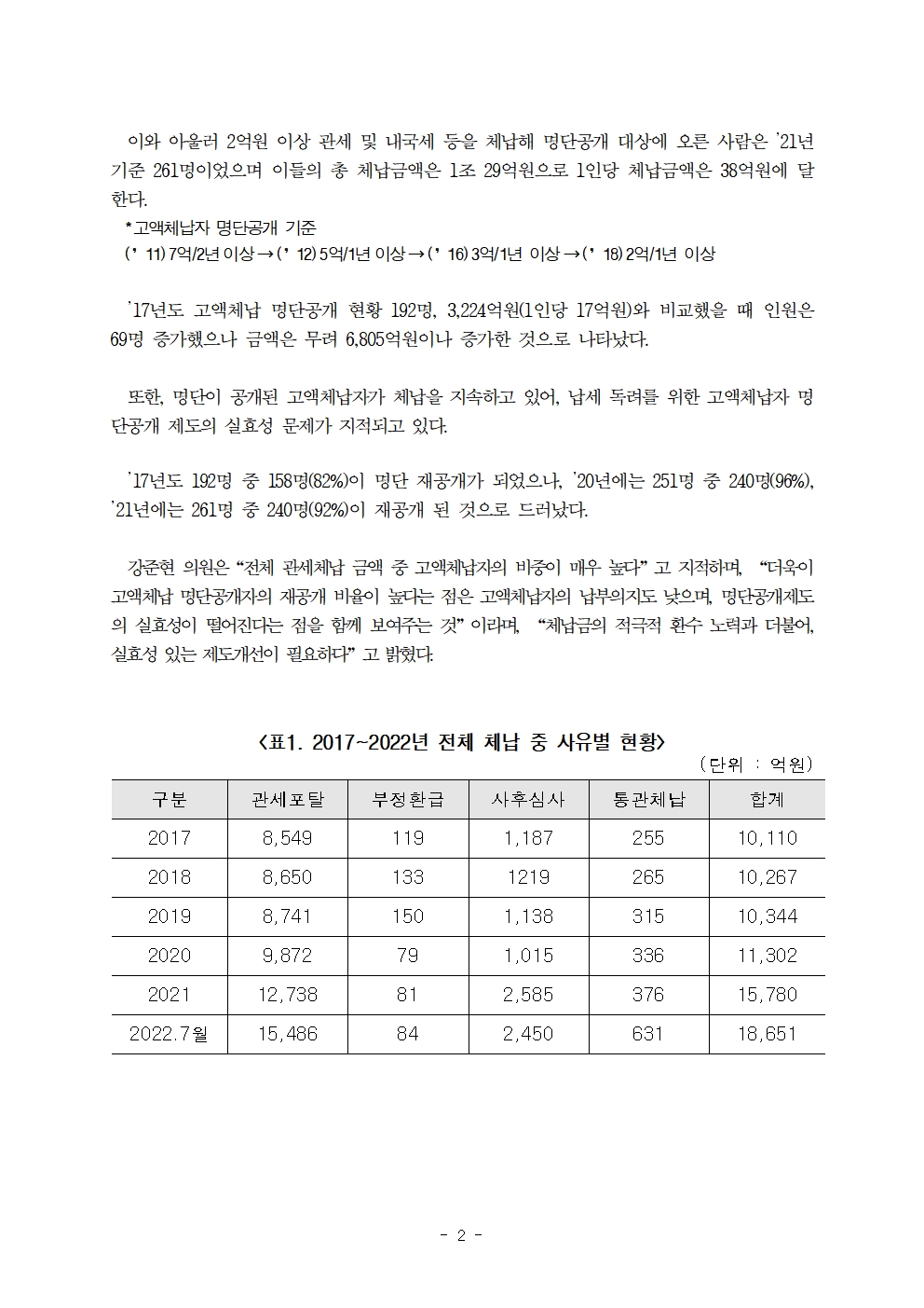 [국회의원 강준현][보도자료]2억원 이상 관세 고액체납자 92%는 명단 재공개... 체납 지속