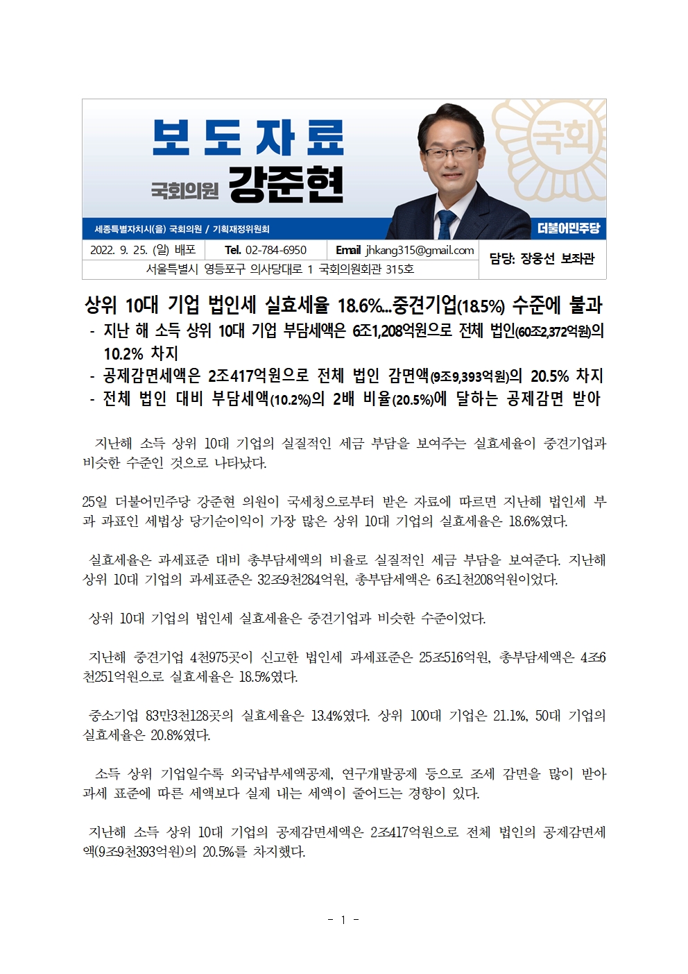 [국회의원 강준현][보도자료]상위 10대 기업 법인세 실효세율 18.6%...중견기업(18.5%) 수준에 불과
