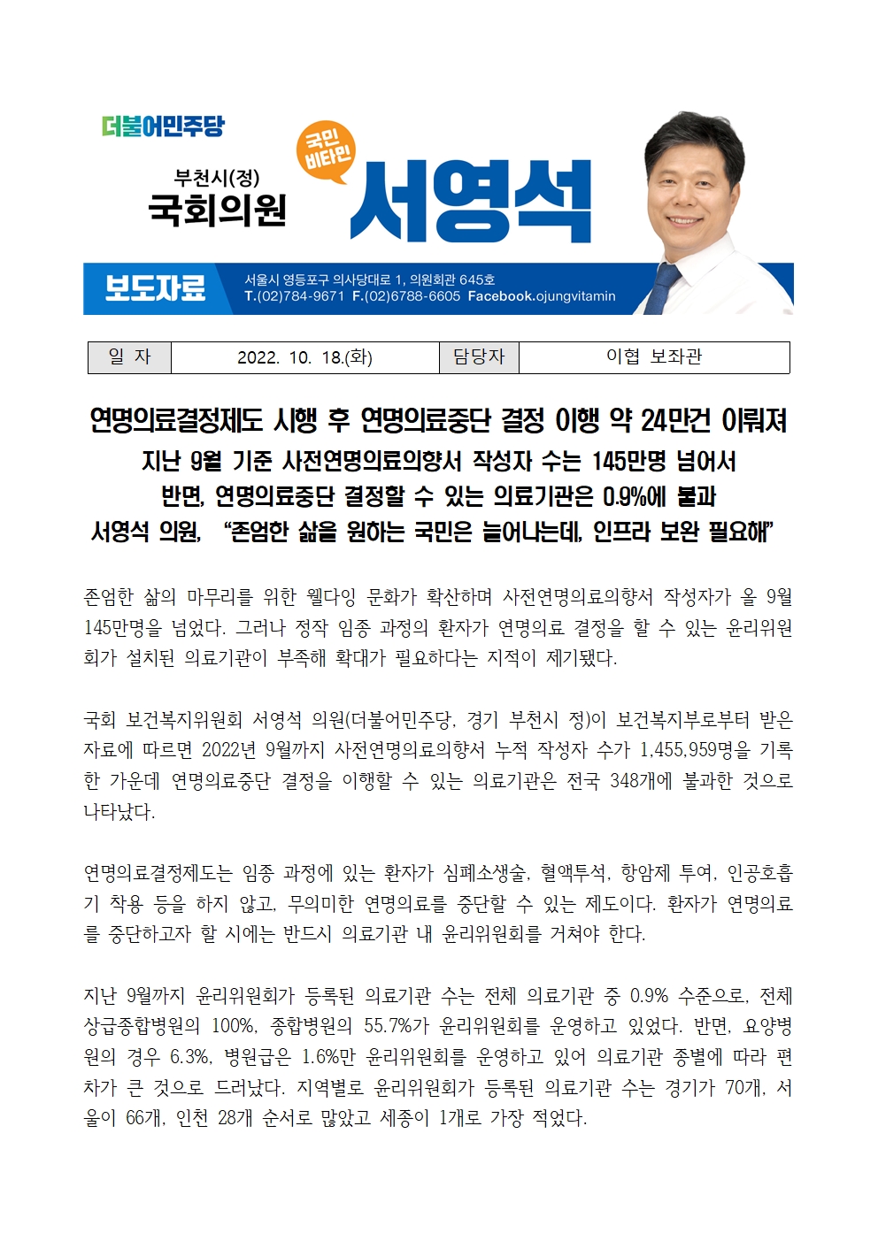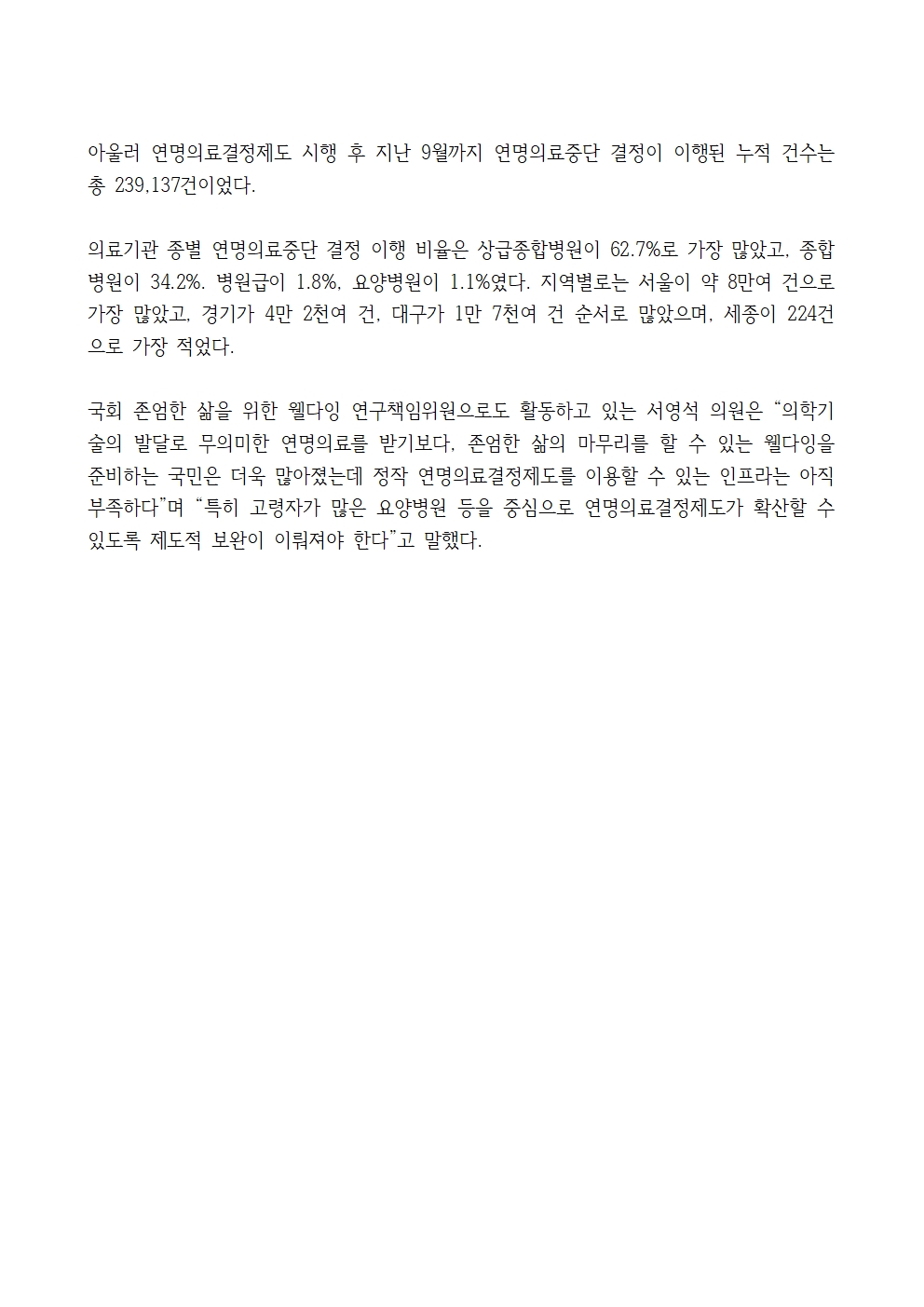 [국회의원 서영석] 연명의료결정제도 시행 후 연명의료중단 결정 이행 약 24만건 이뤄져