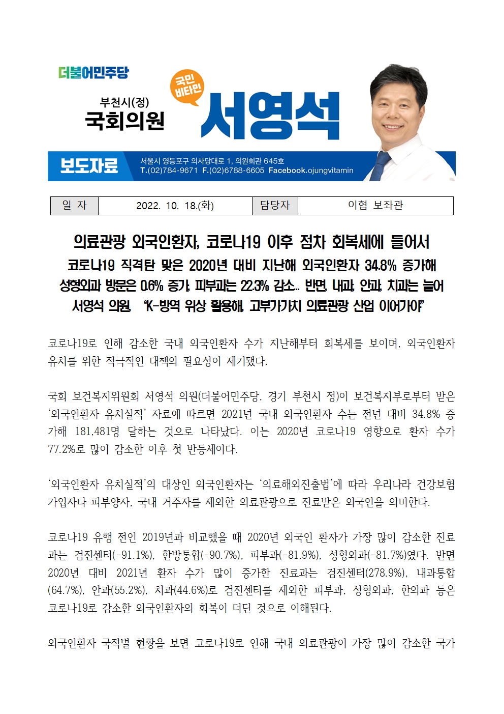 [국회의원 서영석] 의료관광 외국인환자, 코로나19 이후 점차 회복세에 들어서
