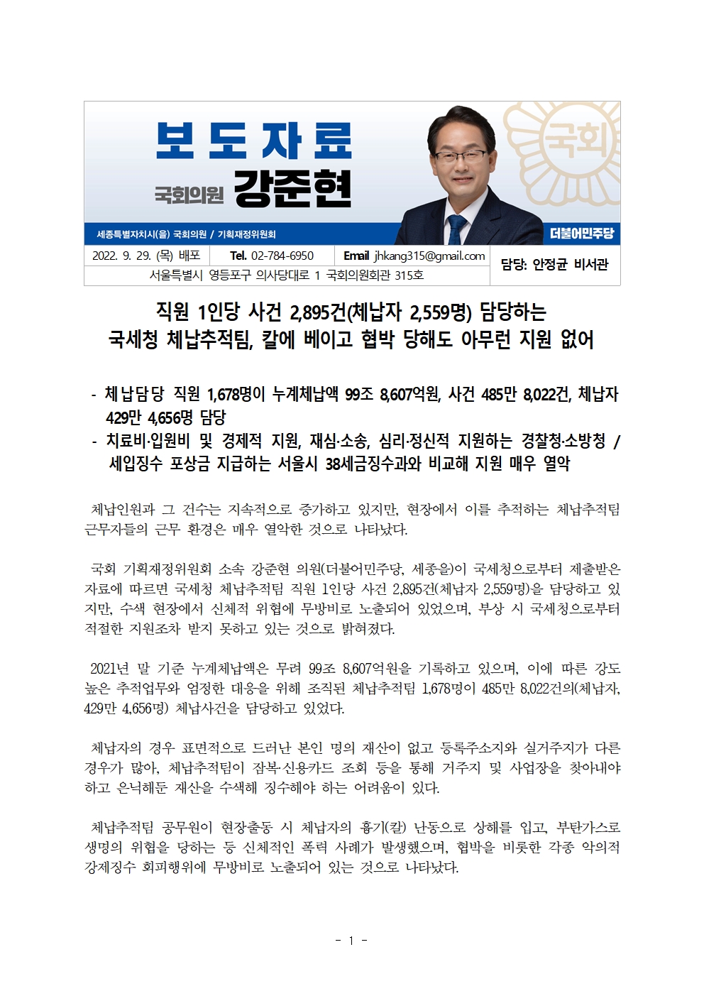 [국회의원 강준현][보도자료]직원 1인당 사건 2,895건(체납자 2,559명) 담당하는 국세청 체납추적팀, 칼에 베이고 협박 당해도 아무런 지원 없어