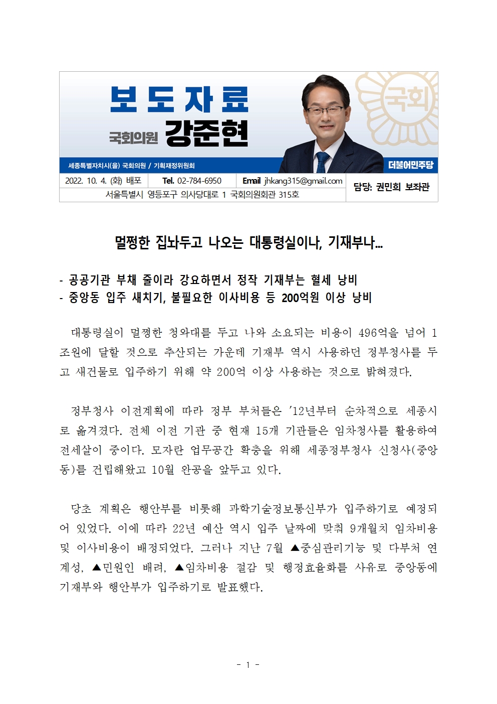 [국회의원 강준현][보도자료]멀쩡한 집놔두고 나오는 대통령실이나, 기재부나...