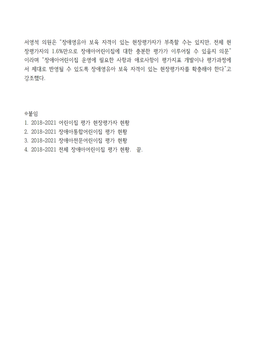 [국회의원 서영석] 장애영유아 보육 자격 있는 어린이집 현장평가자 단 3명