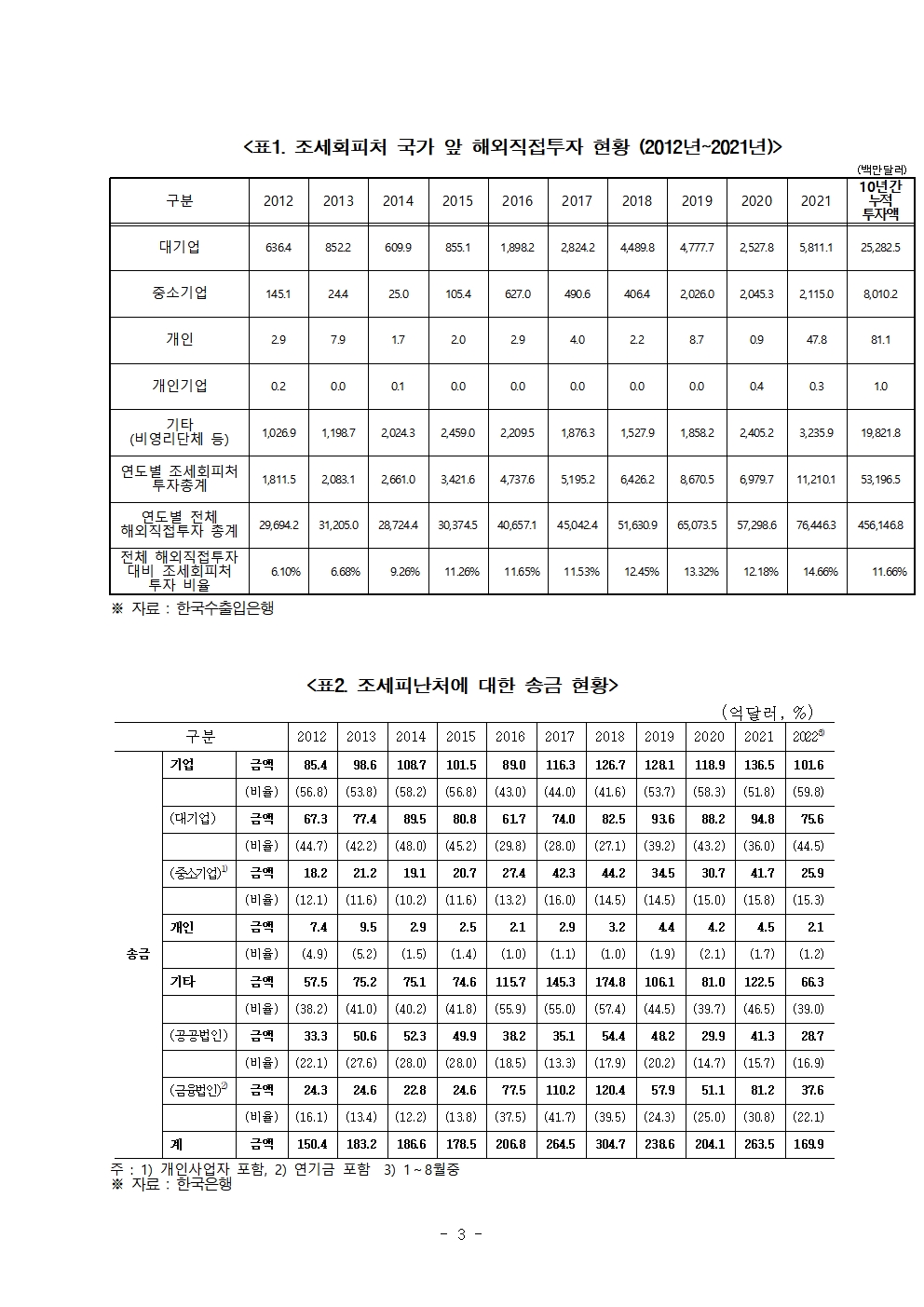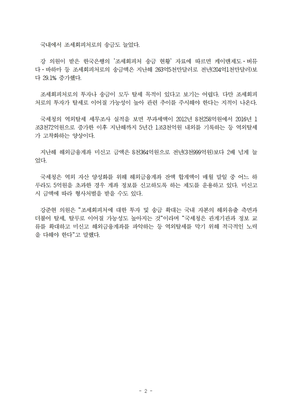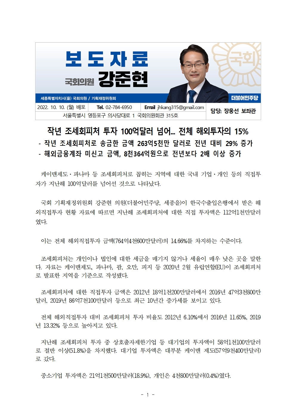 [국회의원 강준현][보도자료]작년 조세회피처 투자 100억달러 넘어... 전체 해외투자의 15%