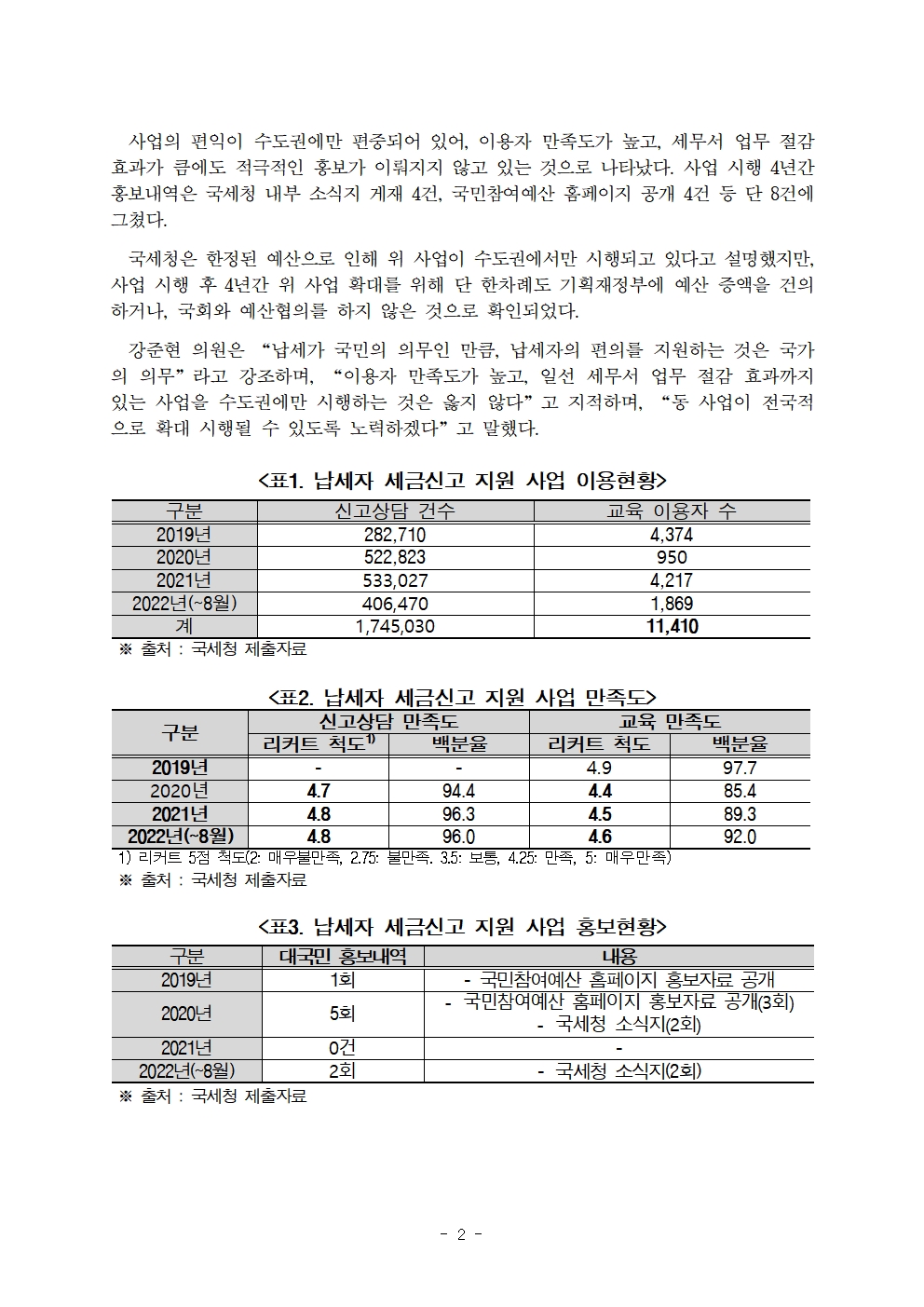 [국회의원 강준현][보도자료]납세자 편익제고 위한 「납세자 세금신고 지원사업」, 사업 추진 4년간 수도권만 시행!