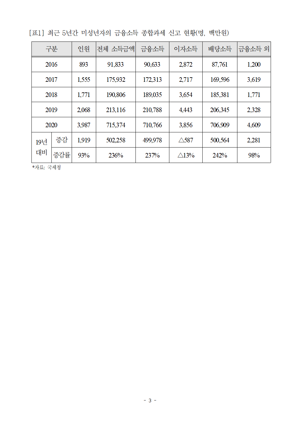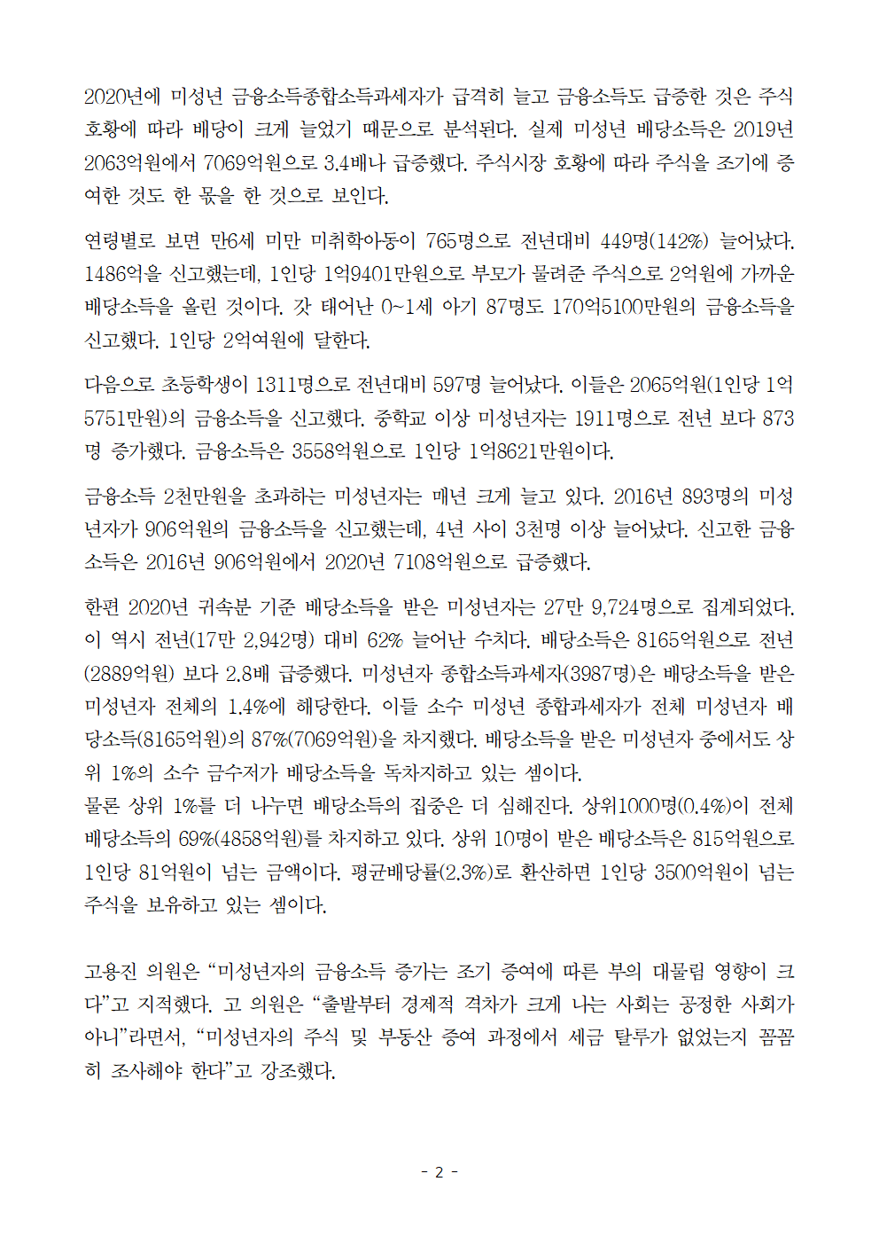 [고용진 보도자료] 금융소득 2천만원 넘는 금수저 미성년자 4천명, 1억8천씩 벌어