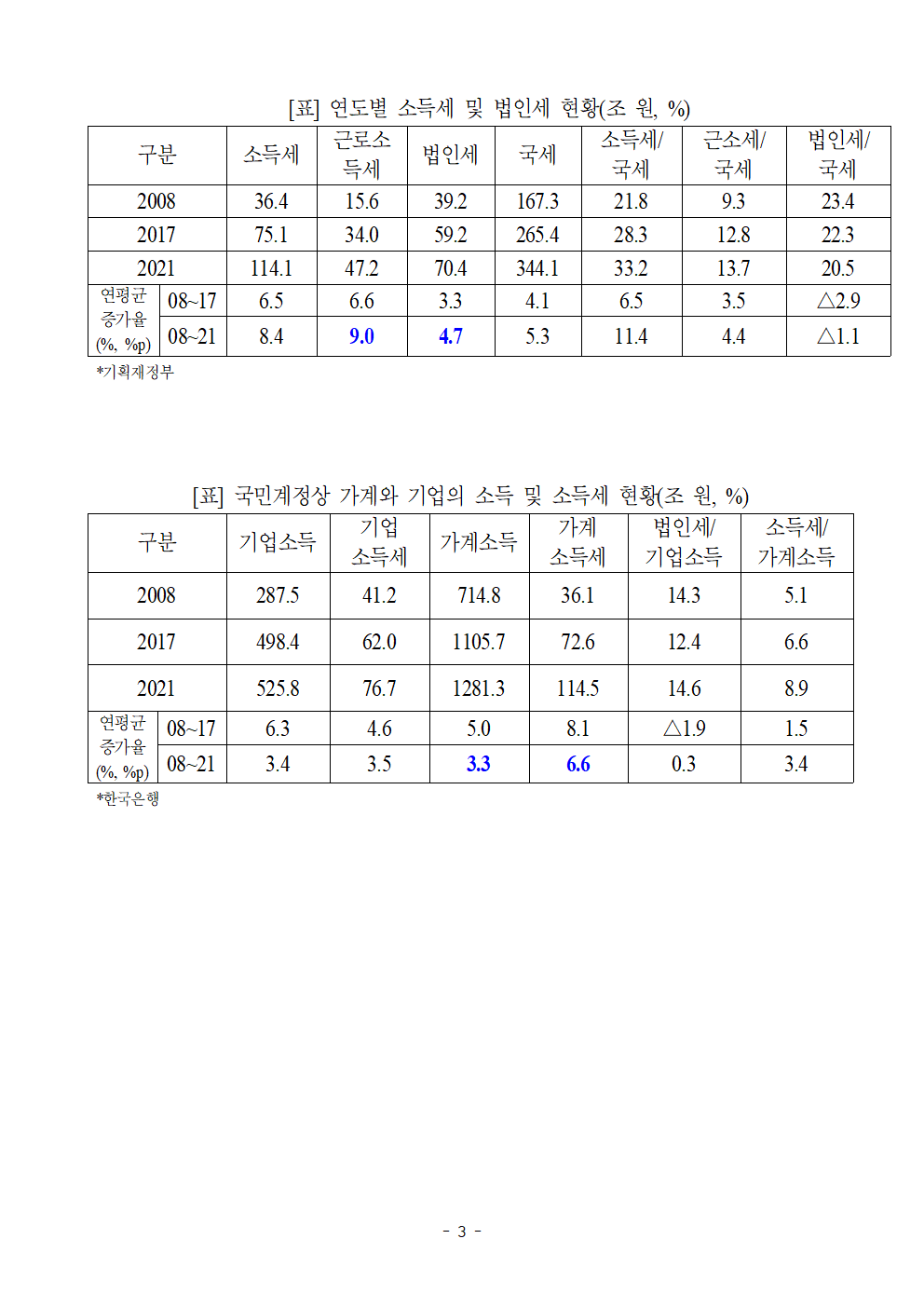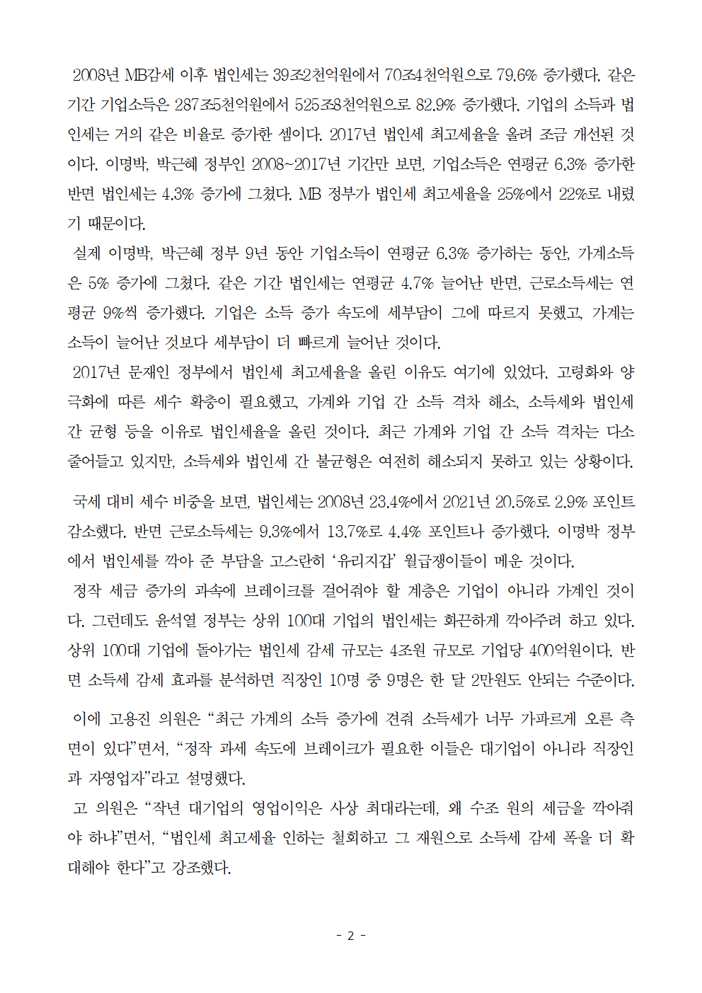 [고용진 보도자료] ‘유리지갑’ 소득세 연평균 9% 늘 동안 법인세 4.7%