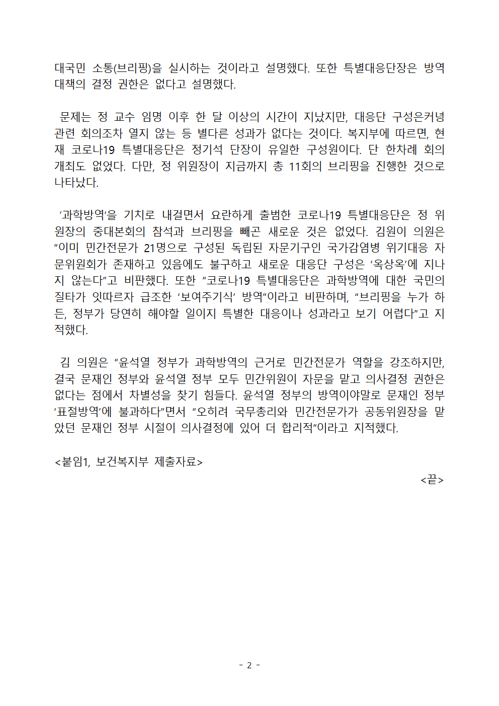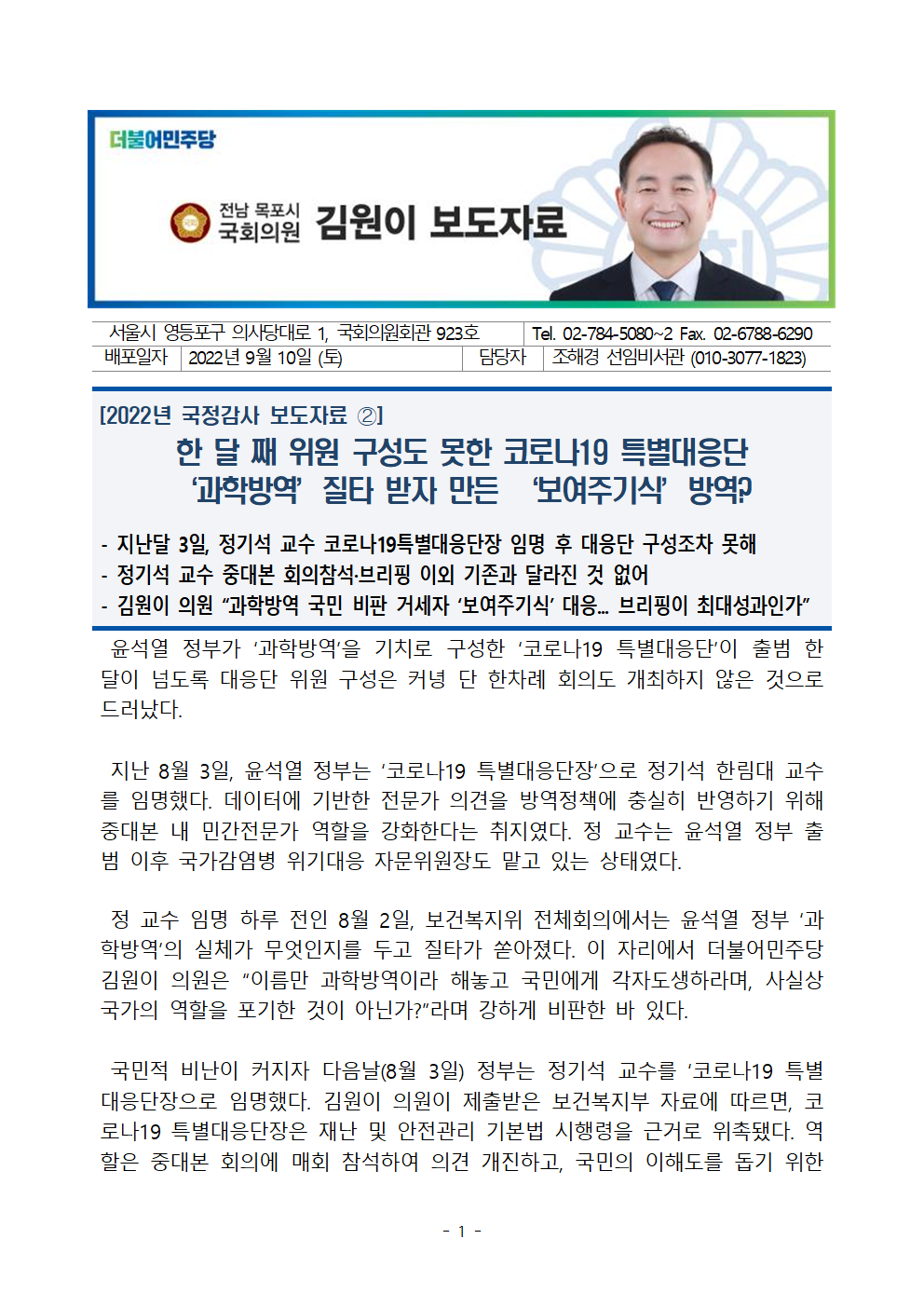 김원이의원_보도자료_2번_한_달_째_위원_구성도_못한_코로나19_특별대응단,_‘과학방역’_질타_받자_만든_‘보여주기식’_방역_220910.hwp