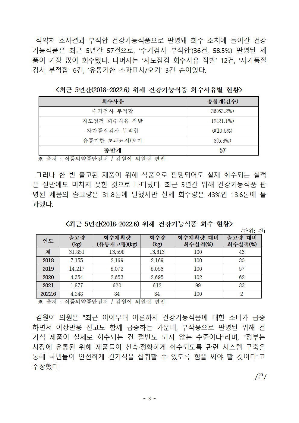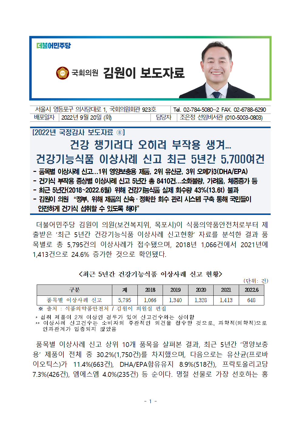 [김원이 보도자료] 건강 챙기려다 오히려 부작용 생겨...건기식이상사례 신고 최근 5년간 5,700여건