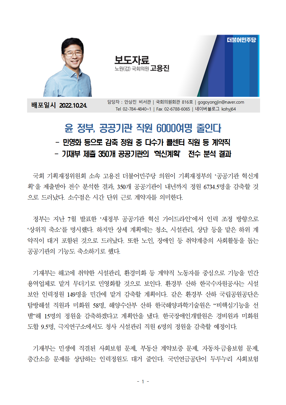 221024_고용진_보도자료_윤_정부,_공공기관_직원_내년까지_6000명_줄인다.hwp