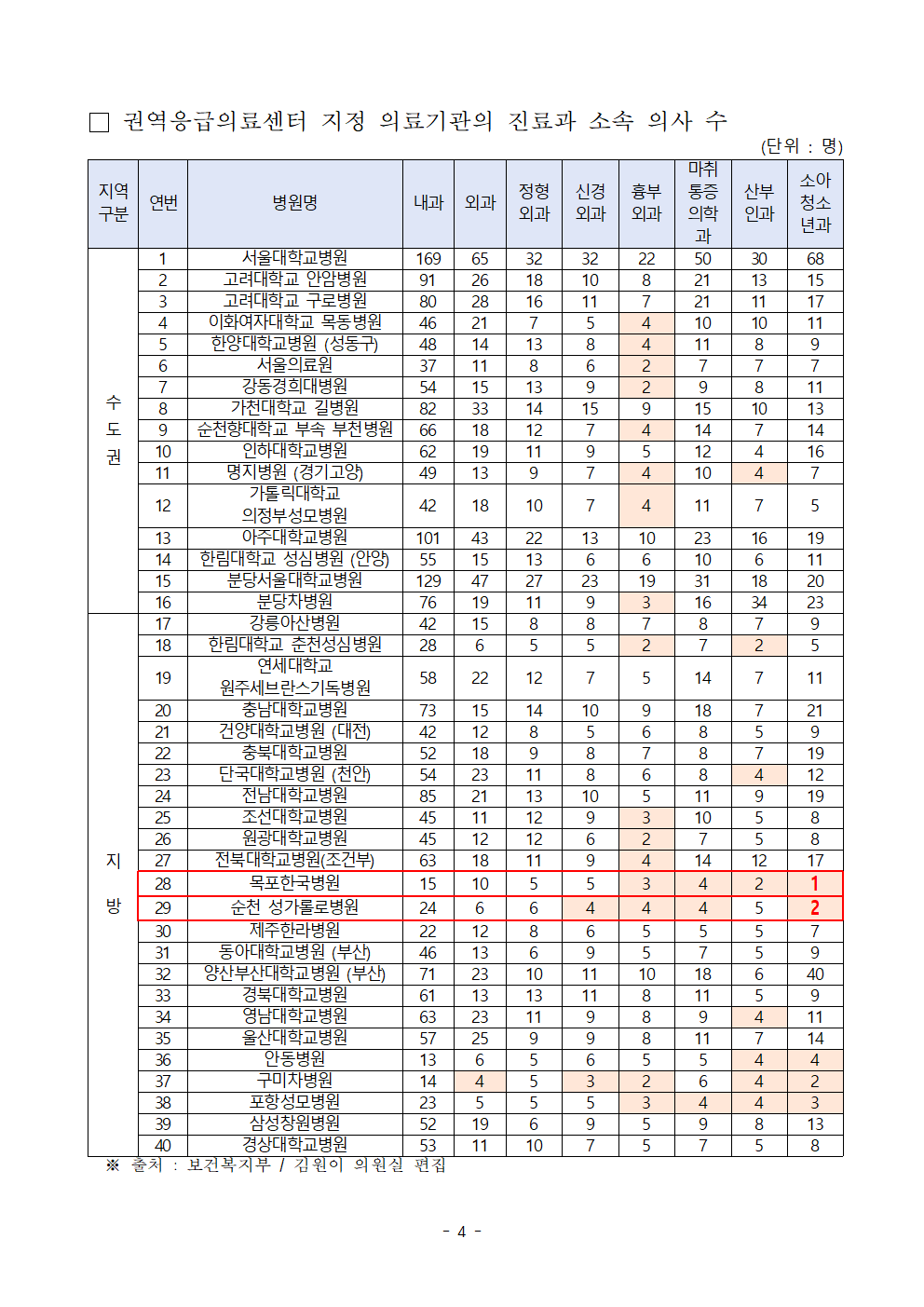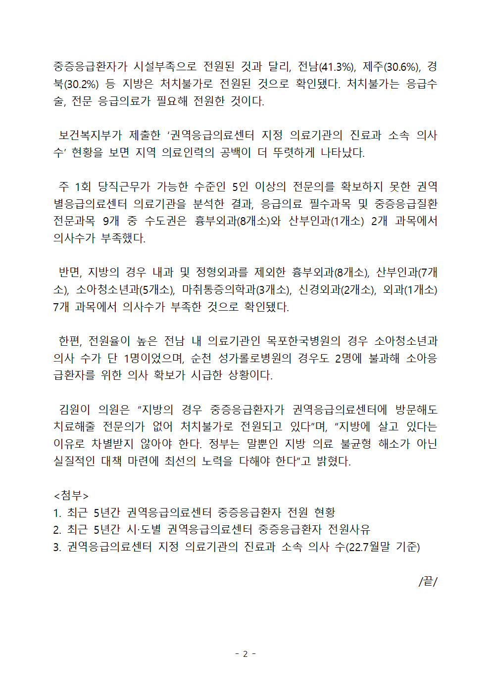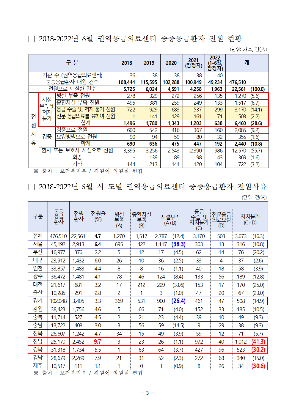 [김원이 보도자료] 처치불가로 전원된 권역응급의료센터 중증응급환자 지방일수록 높아